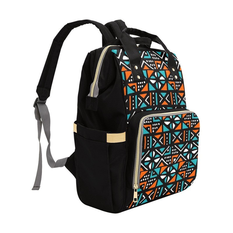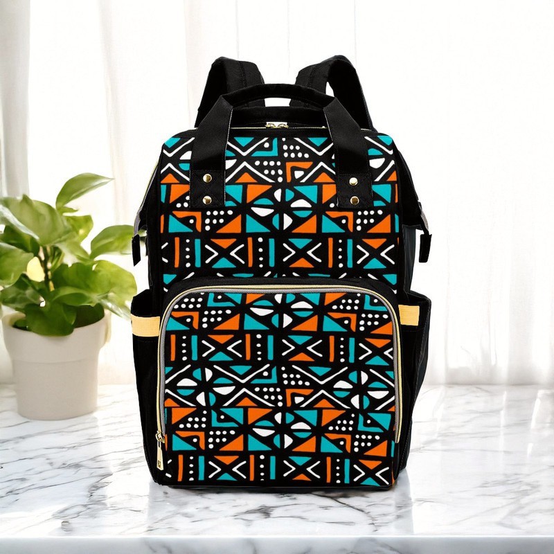 Boldly explore with our African Bogolan Mudcloth Backpack. Featuring authentic Afro Fashion, this backpack is not just a stylish choice but also a functional diaper bag. Take on any adventure with ease and standout in boldness. Product Description * Made from high-grade nylon, lightweight yet sturdy. * Wide open design, large interior with 1 zippered pocket and 4 elastic pockets. * One front section with 3 elastic pockets and 1 net pocket for milk bottles and other items. * Padded back panel and adjustable shoulder straps for ultra comfort and stability. * Unisex design makes the diaper bag a nice choice for both mom and dad. Delivery Time This item will be processed within 3-7 business days (Excluding Weekends and Holidays). Once products ships it can take up to 15 Business days depending on your location. Out of Stock items can be requested by emailing us at [email protected] Care Instructions Machine wash cold inside out. Gentle cycle with mild detergent and like colors. Do not use bleach or fabric softener. Do not tumble dry. Hang to dry to ensure maximum shelf life. Iron inside out if necessary. Do not iron the print. Do not dry clean.