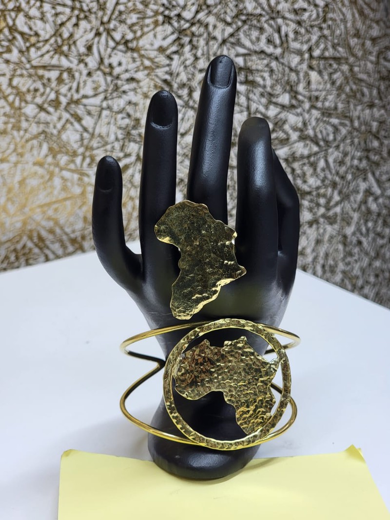 Rock our stunning gold-tone cuff bracelet and ring, showcasing a beautifully crafted African continent design, blending cultural pride with bold elegance. The textured finish and open-ring style make it a standout statement piece. Order yours today!