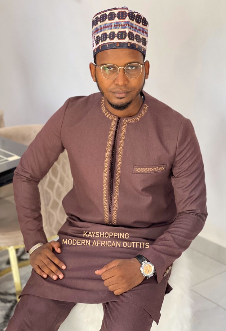Costume Africain Bleu cousu avec de la laine. Modèle faux 3 pièces double broderie