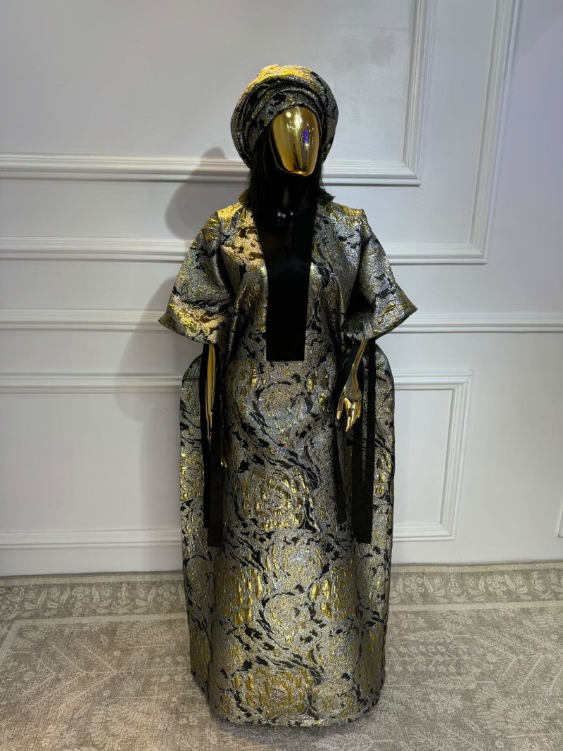 It comes paired with a matching headpiece to complete the look, making it a satement of heritage, grace, and luxury, designed to celebrate African fashion in all its splendor.