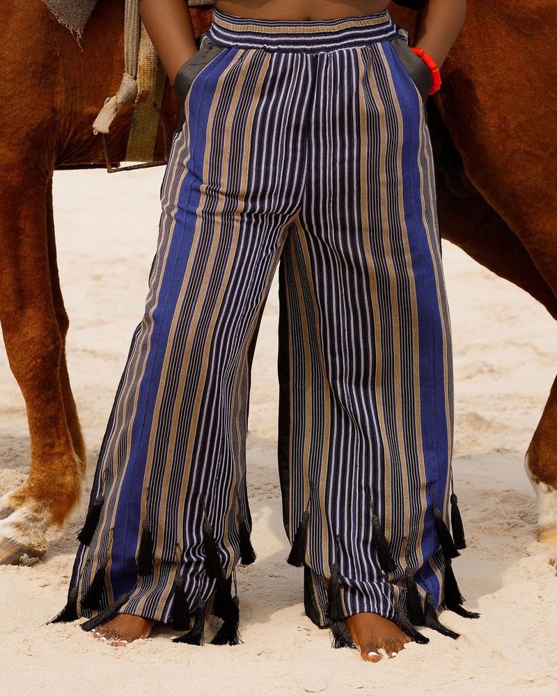 Big pants, bigger energy! The ERELU Pants serve drama, texture and serious movement. Designed with Asooke fabric and spiced with fluttering black tassels,
