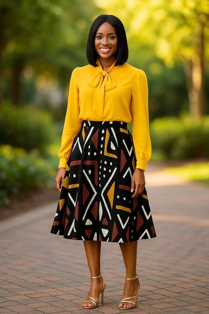 Unleash your adventurous spirit with our African Flare Skirt Bogolan Print! Designed to make a bold statement, this midi length flared skirt is crafted from traditional Bogolan fabric for a unique and daring look. Feel confident and empowered as you take on the world in this high-waisted and flared skirt. Make a statement and stand out from the crowd!