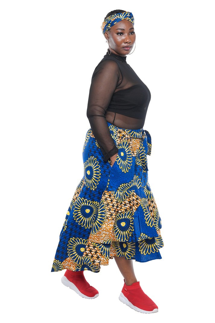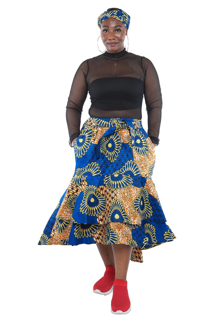 This African High Low Two Tier Skirt is made from 100% cotton, providing a comfortable and lightweight feel. The unique two tier design adds a stylish touch, while the high low hemline offers a flattering silhouette. Perfect for adding a pop of African flair to any outfit. Elasticated Waist Band One Size Two Convenient Pockets Head Wrap