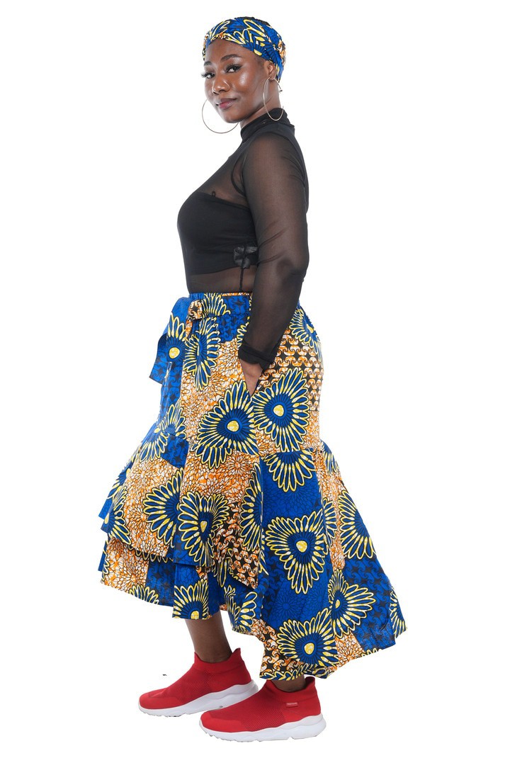 This African High Low Two Tier Skirt is made from 100% cotton, providing a comfortable and lightweight feel. The unique two tier design adds a stylish touch, while the high low hemline offers a flattering silhouette. Perfect for adding a pop of African flair to any outfit.