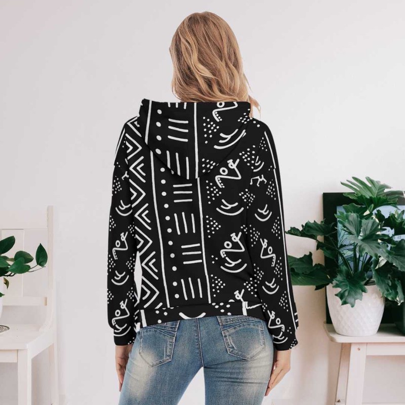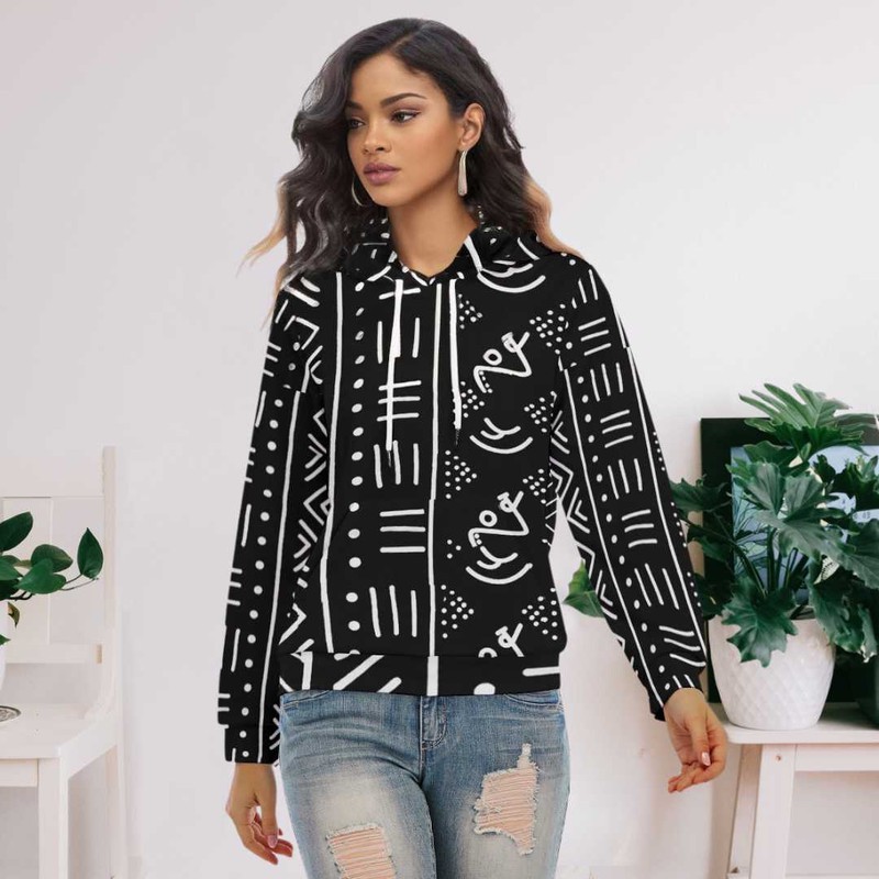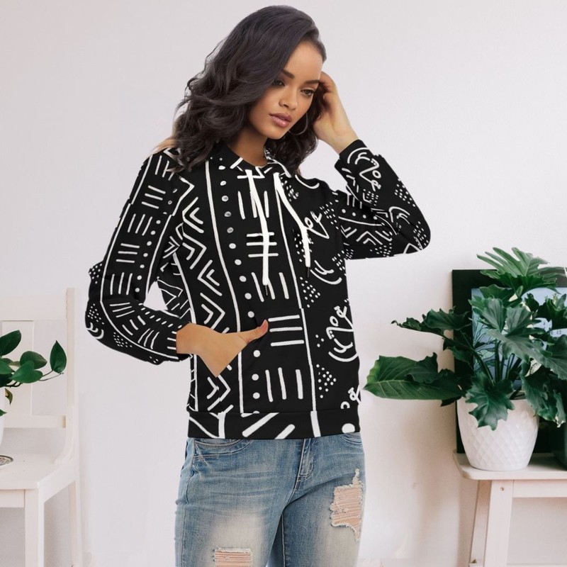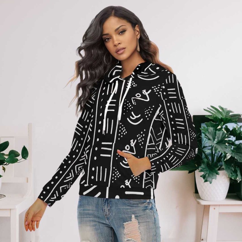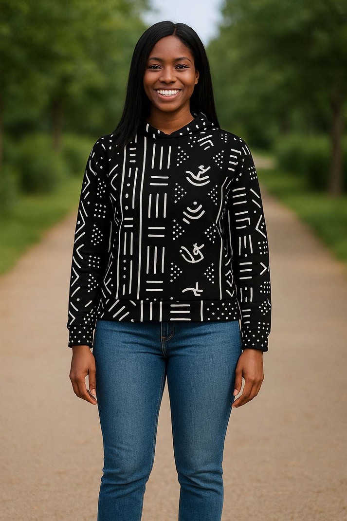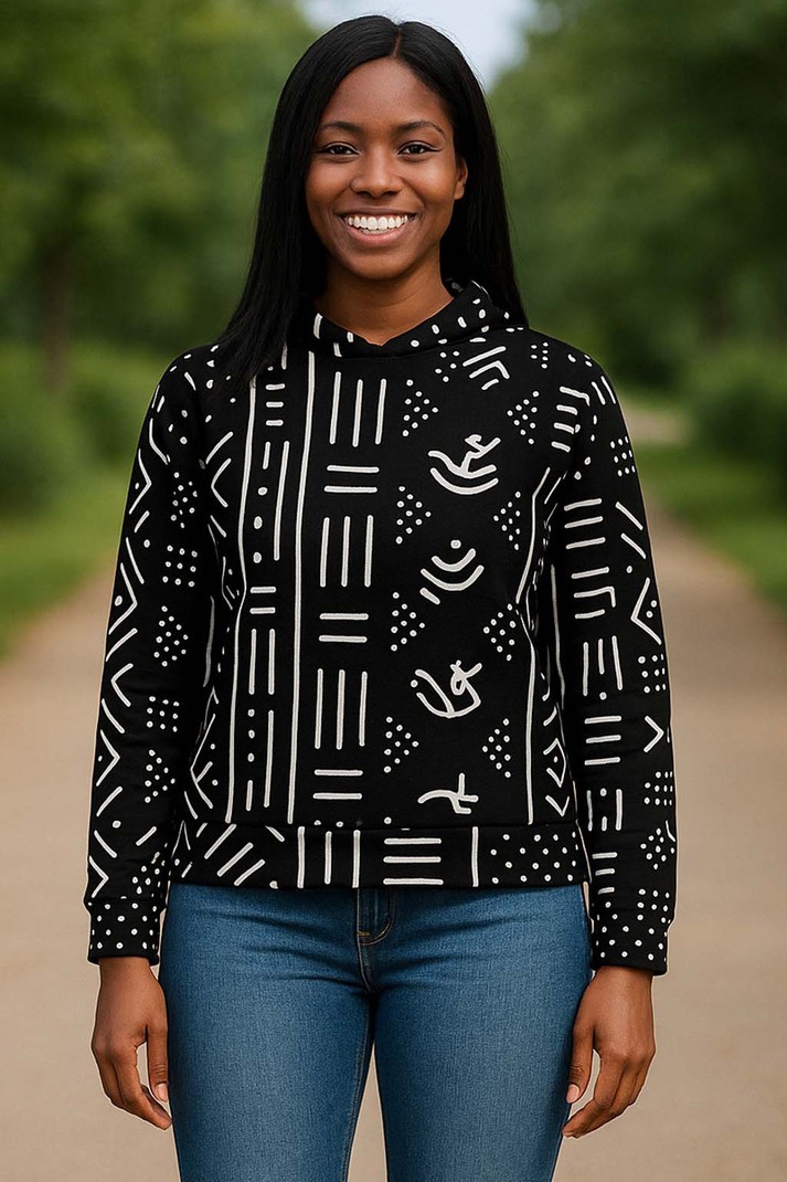This African hoodie for women features traditional bogolan print fabric. The lightweight design ensures comfortable wear in any weather, and the extended hood ensures optimal coverage from the elements. The stylish print adds a unique and eye-catching detail, creating a chic and fashionable look. Product Features Please Compare your Measurements To our Size Chart *Polyester 94%, Spandex 6%, super soft. *Personalized classic-cut hoodie for Women, comfortable and stylish. *Features pronounced sleeve cuffs, prominent waistband hem and kangaroo pocket fringes. *Taped neck and shoulders for comfort and style. Delivery Time This item will be processed within 3-7 business days (Excluding Weekends and Holidays). Once products ships it can take up to 15 Business days depending on your location. Out of Stock items can be requested by emailing us at [email protected] Care Instructions Machine wash cold inside out. Gentle cycle with mild detergent and like colors. Do not use bleach or fabric softener. Do not tumble dry. Hang to dry to ensure maximum shelf life. Iron inside out if necessary. Do not iron the print. Do not dry clean.