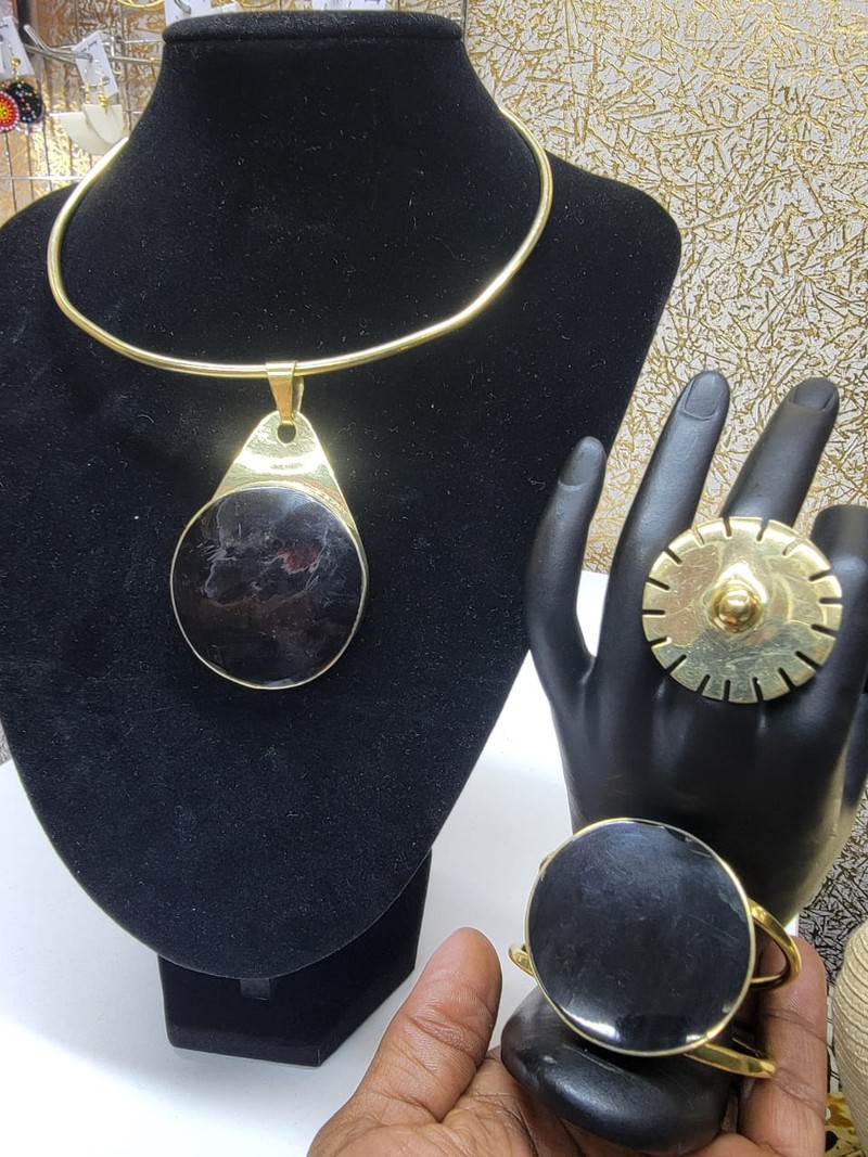 This striking gold necklace and bracelet, handcrafted by Kenyan artisans, features a circular design with a central blue gemstone surrounded by intricate wire patterns. A perfect blend of cultural heritage and artistic craftsmanship, it’s designed to add a touch of regal elegance to any outfit.