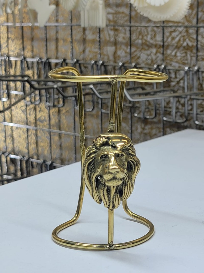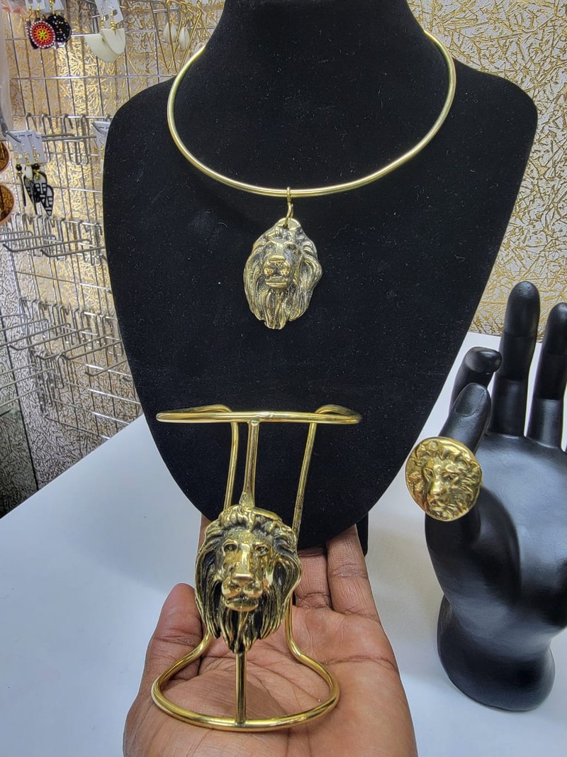 This striking gold bracelet and necklace, handcrafted by Kenyan artisans, features a lion's head design surrounded by intricate wire patterns. A perfect blend of cultural heritage and artistic craftsmanship, it’s designed to add a touch of regal elegance to any outfit.