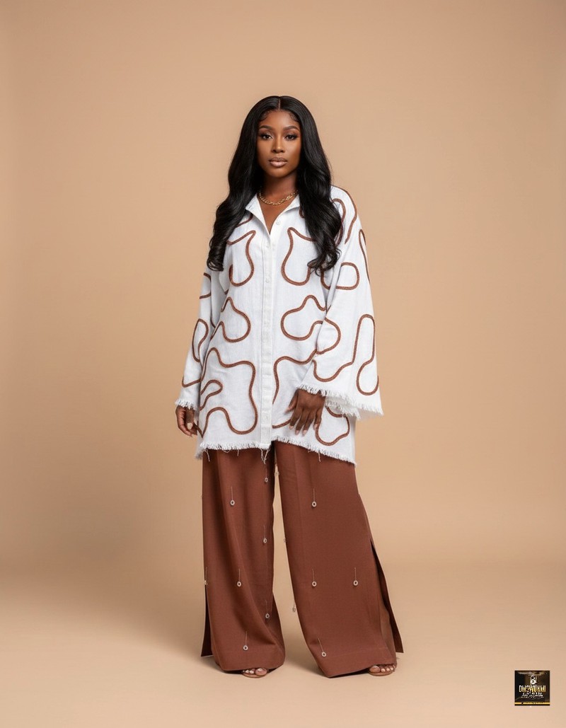 This striking ensemble features a crisp, white, oversized button-down shirt that serves as a vibrant canvas for an abstract, continuous pattern of thick, brown, free-flowing lines, giving the garment an artistic and contemporary feel. The shirt is further distinguished by raw, fringed edges along the hem and cuffs, which add a touch of bohemian texture and relaxed sophistication to the look. It is perfectly paired with wide-leg, high-waisted trousers in a rich, warm brown tone, which provides a grounding contrast to the shirt; these trousers feature subtle, coordinating embroidered details and side splits that introduce movement and modern flair. This outfit is ideally suited for smart-casual events, such as an art gallery opening, a high-end brunch, a creative-industry networking event, or a stylish vacation dinner, where its unique blend of comfort, elegance, and statement-making design will appeal to customers seeking standout pieces for their contemporary wardrobe. Material: handwoven aso-oke & crepe Color: Multicolor