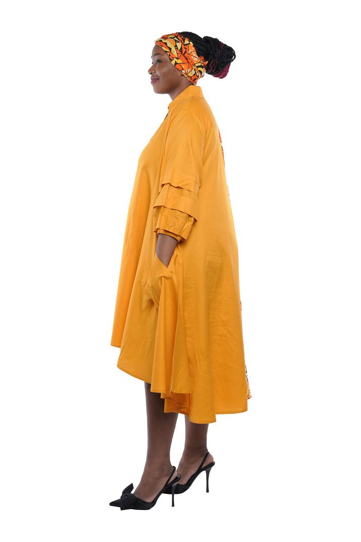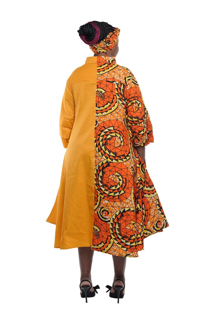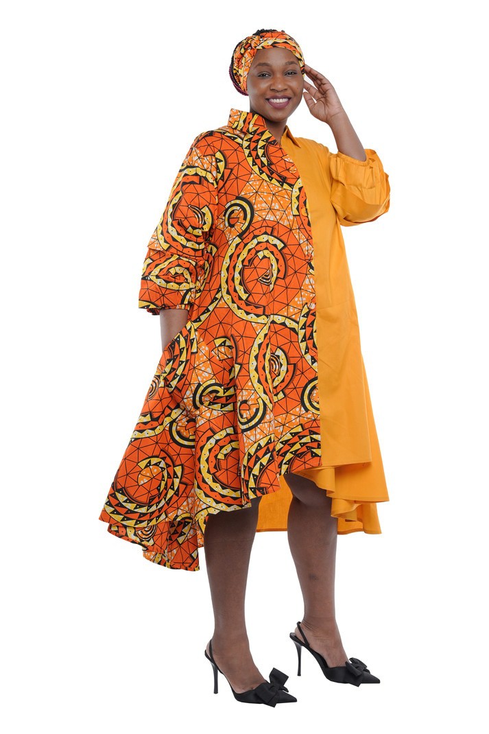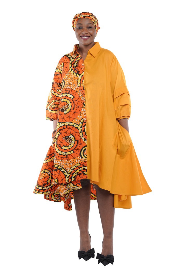 Made from 100% cotton fabric, the dress features 2 convenient pockets and a matching headwrap. The split down the middle design showcases a masterful selection of vibrant orange colors. Stand out from the crowd and embrace the culture with this stunning dress.