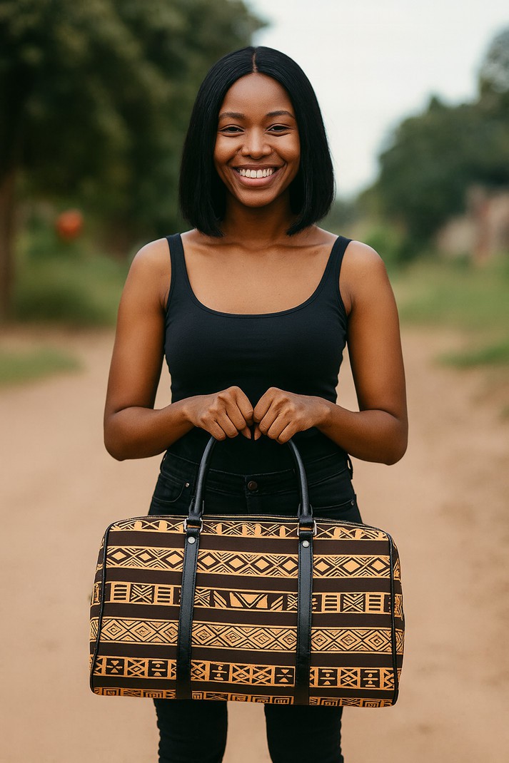 This African leather bag features an ancient bogolan pattern, perfect for the stylish and adventurous traveler. Crafted with high-quality leather, this bag is durable and provides ample storage for all your essentials. Take on your next journey with confidence and style. Product Description * Made of New high-grade PU leather, not easily wrinkled. • Features PU leather top handle and binding for comfortable carrying. • One main compartment, big enough to bring clothing, cosmetic bag, sunglasses • Come with adjustable shoulder strap with metal clips. • Suitable for workout and short-term or long-term travel. • Wipe gently with cloth. Delivery Time This item will be processed within 3-7 business days (Excluding Weekends and Holidays). Once products ships it can take up to 15 Business days depending on your location. Out of Stock items can be requested by emailing us at [email protected] Care Instructions Machine wash cold inside out. Gentle cycle with mild detergent and like colors. Do not use bleach or fabric softener. Do not tumble dry. Hang to dry to ensure maximum shelf life. Iron inside out if necessary. Do not iron the print. Do not dry clean.
