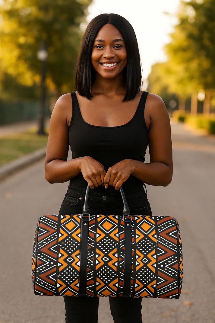 Crafted with durable African PU leather, this bag is perfect for travel. Its artistic mud cloth pattern adds a unique touch. With plenty of space for your belongings, this bag combines style and functionality for all your travels. Product Description * Made of New high-grade PU leather, not easily wrinkled. • Features PU leather top handle and binding for comfortable carrying. • One main compartment, big enough to bring clothing, cosmetic bag, sunglasses • Come with adjustable shoulder strap with metal clips. • Suitable for workout and short-term or long-term travel. • Wipe gently with cloth. Delivery Time This item will be processed within 3-7 business days (Excluding Weekends and Holidays). Once products ships it can take up to 15 Business days depending on your location. Out of Stock items can be requested by emailing us at [email protected] Care Instructions Machine wash cold inside out. Gentle cycle with mild detergent and like colors. Do not use bleach or fabric softener. Do not tumble dry. Hang to dry to ensure maximum shelf life. Iron inside out if necessary. Do not iron the print. Do not dry clean.