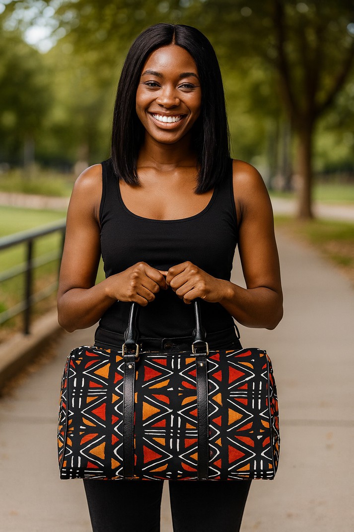 This African leather bag is perfect for travel, featuring a unique Bogolan geometric pattern. Handmade with genuine leather, it is durable and stylish. The intricate pattern adds cultural significance, making it a great conversation starter. A must-have for anyone looking for a functional and fashionable accessory. Product Description * Made of New high-grade PU leather, not easily wrinkled. • Features PU leather top handle and binding for comfortable carrying. • One main compartment, big enough to bring clothing, cosmetic bag, sunglasses • Come with adjustable shoulder strap with metal clips. • Suitable for workout and short-term or long-term travel. • Wipe gently with cloth. Delivery Time This item will be processed within 3-7 business days (Excluding Weekends and Holidays). Once products ships it can take up to 15 Business days depending on your location. Out of Stock items can be requested by emailing us at [email protected] Care Instructions Machine wash cold inside out. Gentle cycle with mild detergent and like colors. Do not use bleach or fabric softener. Do not tumble dry. Hang to dry to ensure maximum shelf life. Iron inside out if necessary. Do not iron the print. Do not dry clean.