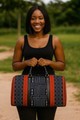 Expertly crafted with African leather, this travel bag boasts a bold ethnic trident print. Perfect for your next adventure, the durable and stylish design will make a statement while keeping your belongings organized and secure. Embrace the rich cultural heritage and functional design of this unique bag.