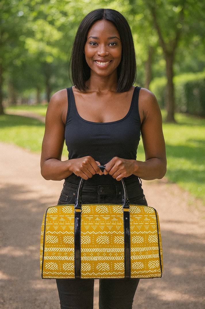 This African leather bag is perfect for travel, combining the durability of leather with the unique design of mud cloth. The minimalist gold accents add a touch of elegance to the bag. Travel in style and comfort with this must-have accessory. Product Description * Made of New high-grade PU leather, not easily wrinkled. • Features PU leather top handle and binding for comfortable carrying. • One main compartment, big enough to bring clothing, cosmetic bag, sunglasses • Come with adjustable shoulder strap with metal clips. • Suitable for workout and short-term or long-term travel. • Wipe gently with cloth. Delivery Time This item will be processed within 3-7 business days (Excluding Weekends and Holidays). Once products ships it can take up to 15 Business days depending on your location. Out of Stock items can be requested by emailing us at [email protected] Care Instructions Machine wash cold inside out. Gentle cycle with mild detergent and like colors. Do not use bleach or fabric softener. Do not tumble dry. Hang to dry to ensure maximum shelf life. Iron inside out if necessary. Do not iron the print. Do not dry clean.