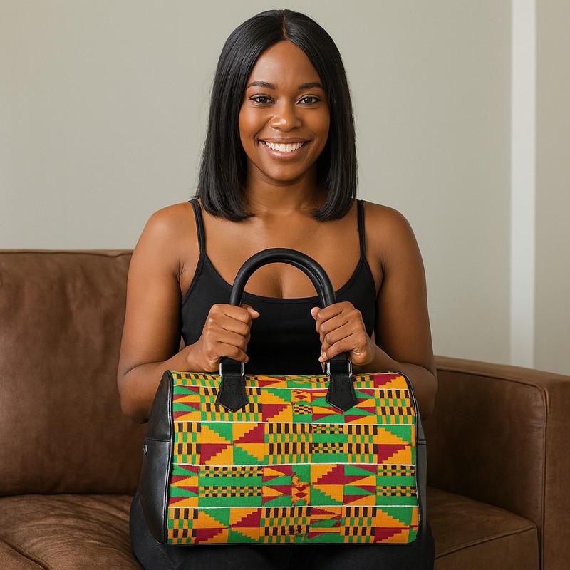This African Leather Handbag features a beautiful Kente Colourful Print. Handcrafted with genuine leather and vibrant, traditional African designs, this bag is both stylish and functional. The perfect accessory for everyday use or special occasions. Support African artisans with this unique and eye-catching handbag.