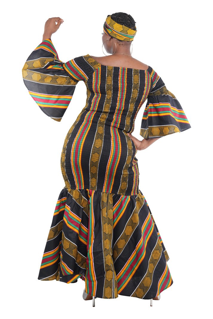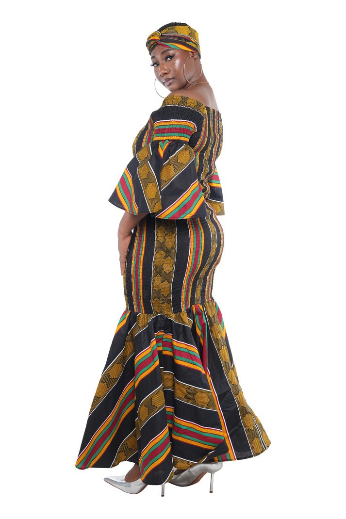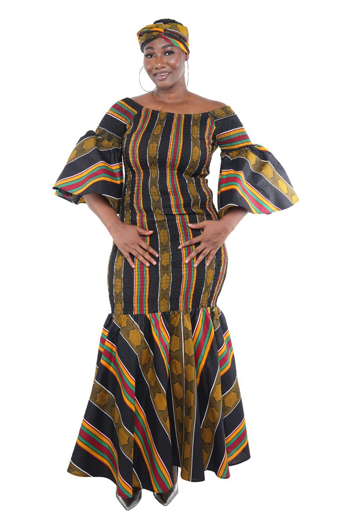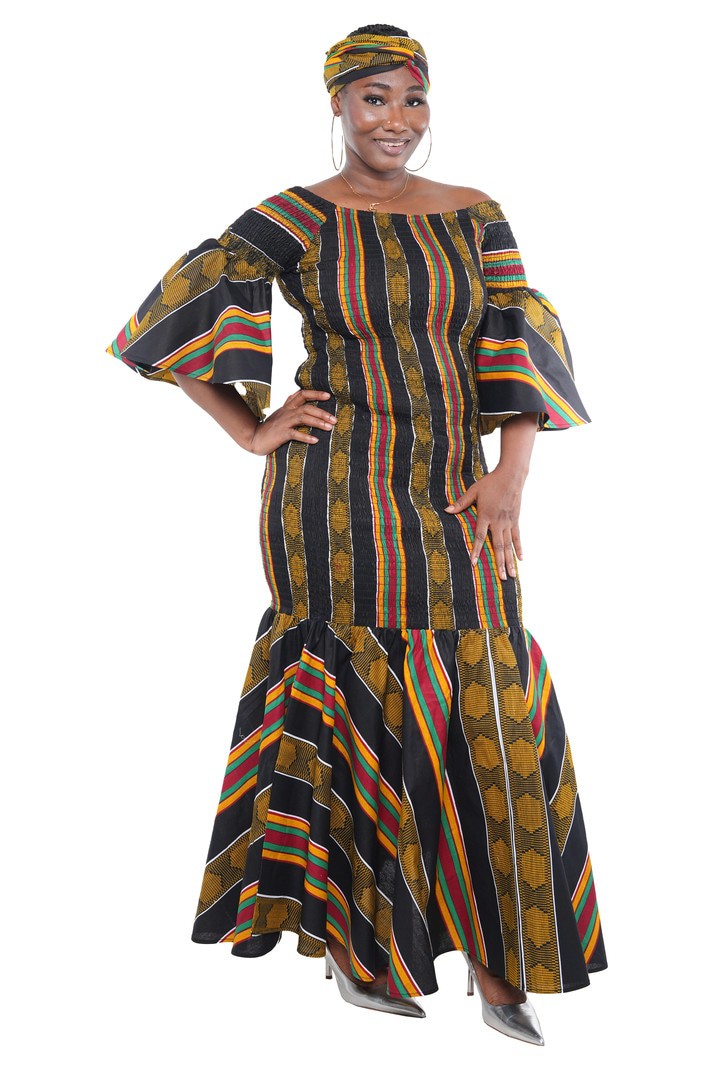 The African Long Smoked Mermaid/Fish Tail Dress a harmonious blend of traditional African aesthetics and contemporary elegance. Expertly crafted from 100% high quality cotton, this dress features a traditional Kente design with modern smocking techniques.