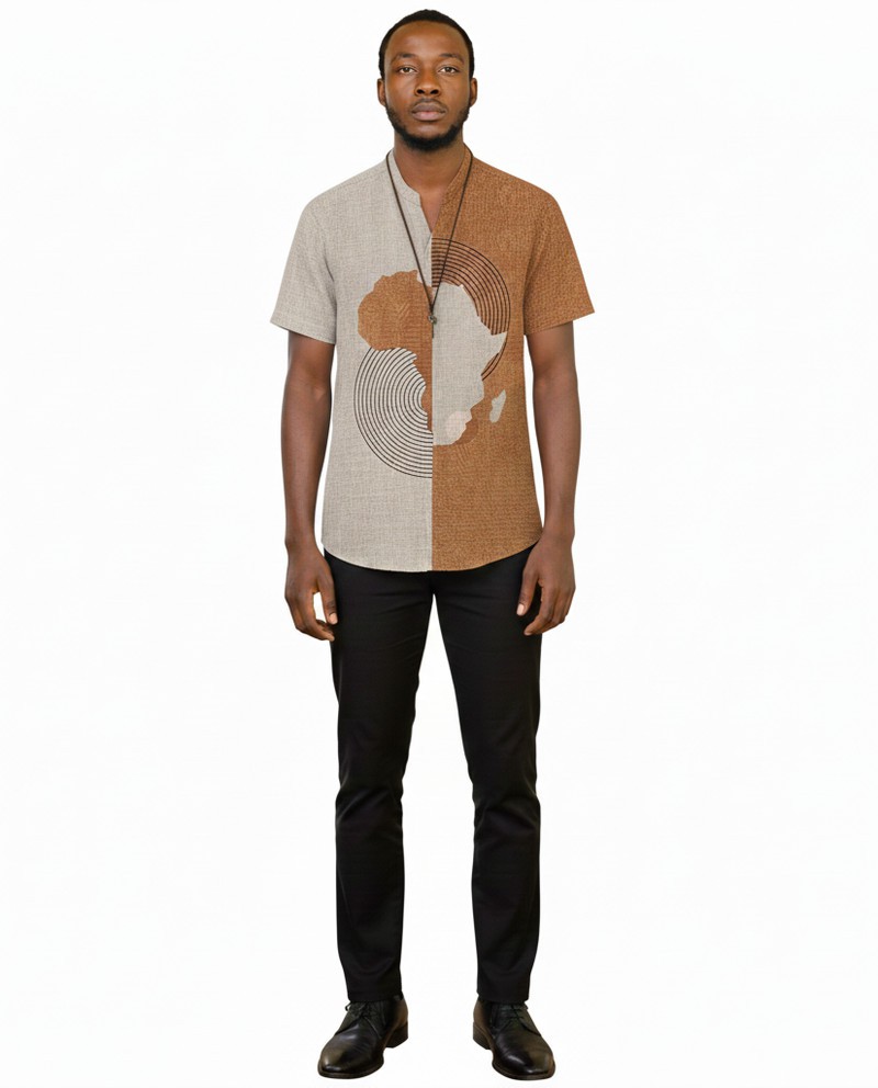 This stylish men's short-sleeve shirt features a unique two-tone design, split into warm textured brown and soft beige panels. The front showcases a bold Africa map graphic with circular line detailing, creating a modern Afro-centric statement. Made with a clean V-cut neckline and a relaxed straight fit, the shirt pairs effortlessly with trousers for casual, cultural, or smart-casual occasions. Perfect for men who love minimalist African fashion with a contemporary twist.