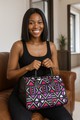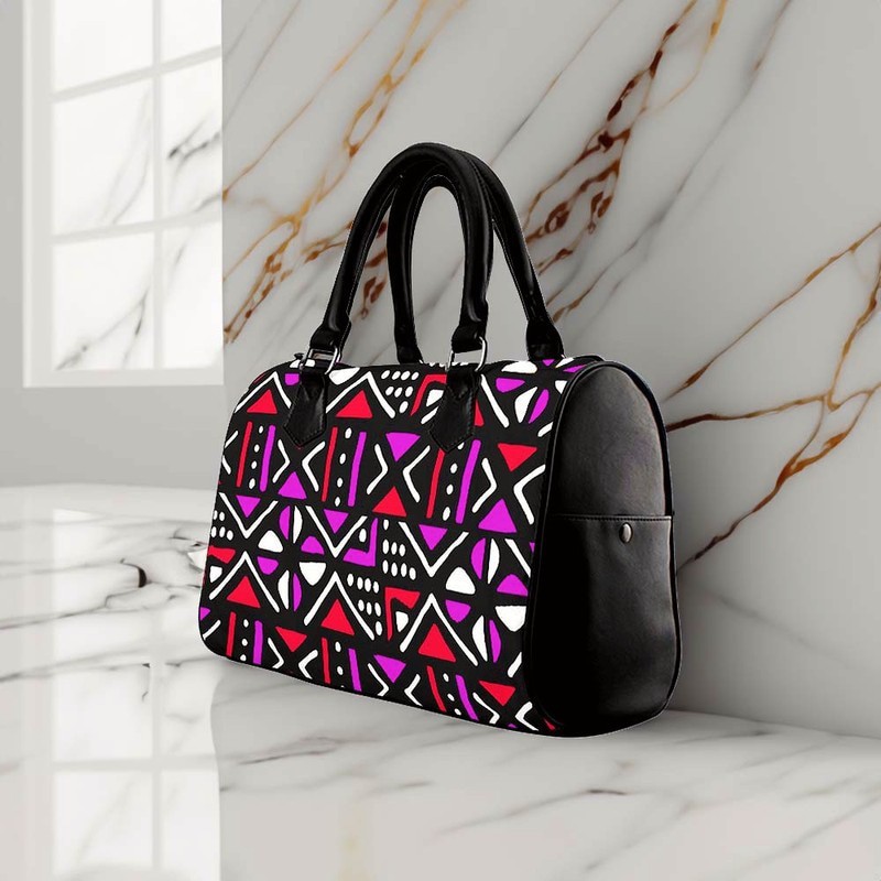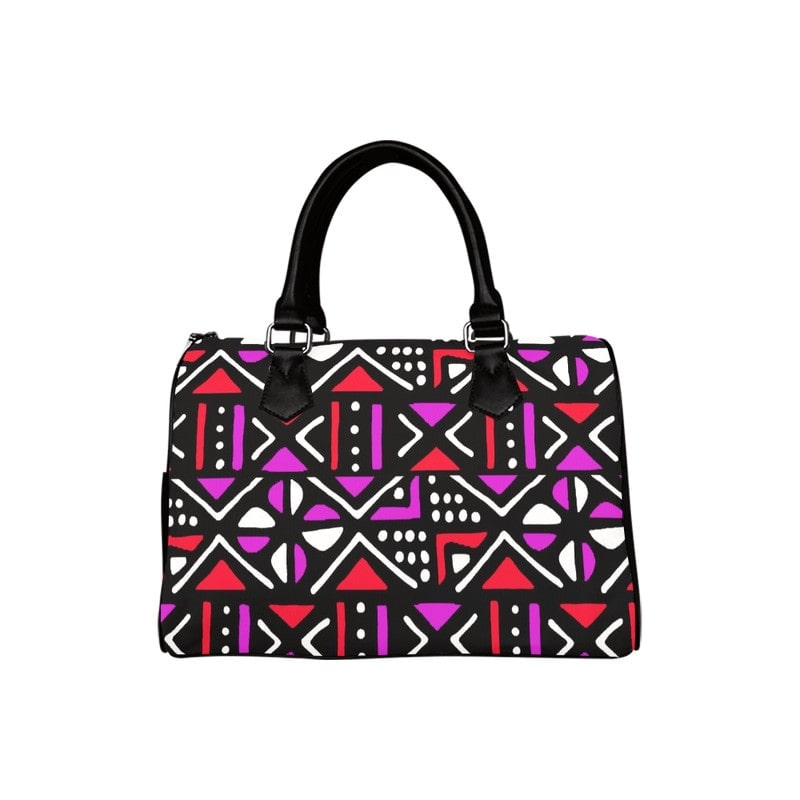 This African Print Handbag features a striking mud cloth pattern in a vibrant geometric pink color. Handmade using traditional techniques, this bag showcases the beauty and craftsmanship of African art and culture. Sturdy and spacious, it's the perfect accessory that combines style and functionality.