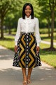 Experience the thrill of the wild with our Cowrie Zigzag African Print Midi Skirt! Featuring bold tribal patterns and stunning cowrie shell accents, this skirt is perfect for the daring and adventurous. Elevate your fashion game with this unique and stylish piece.
