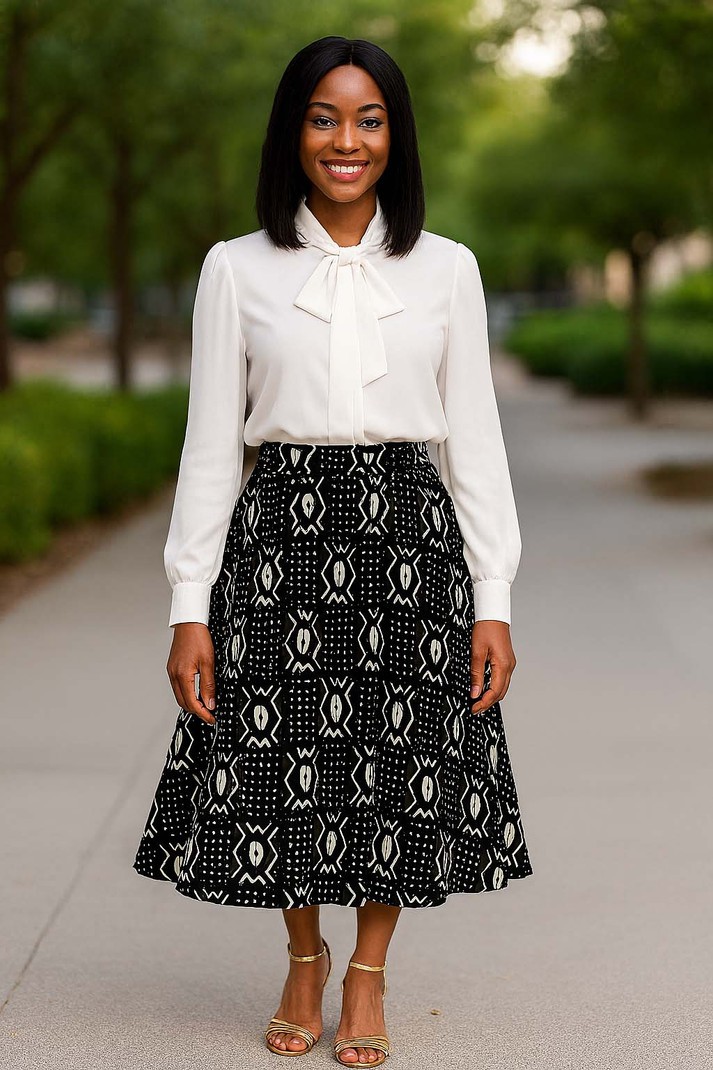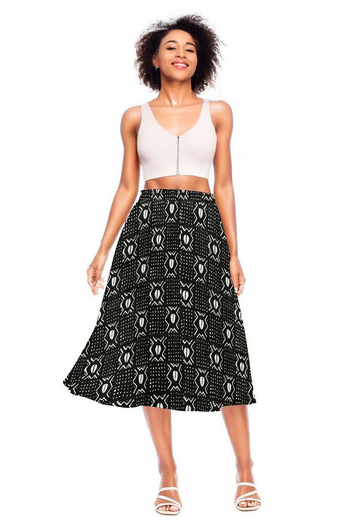 Unleash your adventurous side in our African Skirt Flared Black and White Cowrie Shell Print! This bold and flared midi-length skirt features a striking black and white print, inspired by the iconic Cowrie shell. Perfect for adding a touch of African flair to any outfit. Take on the day with confidence and style!