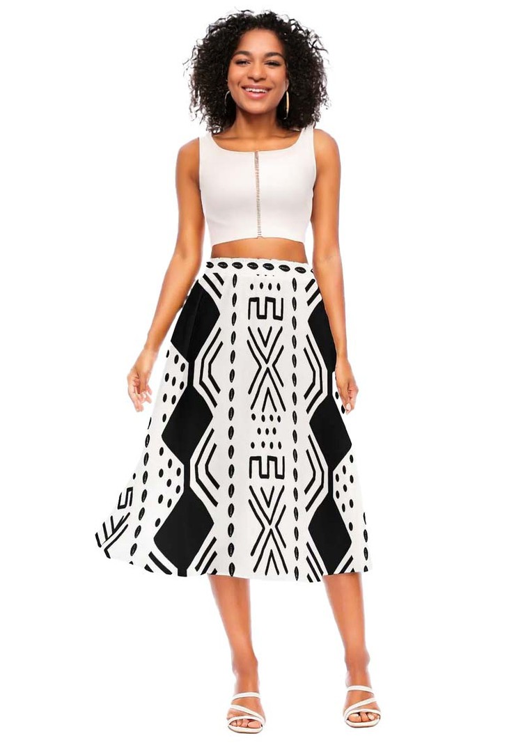 Embrace adventure in our African Skirt Flared | Midi Length! Made with bold White and Black cowrie print, this midi length skirt is perfect for your wardrobe. Its flared design adds a sense of motion, inviting you to step out of your comfort zone and make a statement. Don't miss out on this daring piece! Product Features Please Compare your Measurements To our Size Chart before purchase Fabric: 100% polyester * Regular fit * Waist elastic band * Fabric weight: 80g/m² Delivery Time This item will be processed within 3-7 business days (Excluding Weekends and Holidays). Once products ships it can take up to 15 Business days depending on your location. Out of Stock items can be requested by emailing us at [email protected] Care Instructions Machine wash cold inside out. Gentle cycle with mild detergent and like colors. Do not use bleach or fabric softener. Do not tumble dry. Hang to dry to ensure maximum shelf life. Iron inside out if necessary. Do not iron the print. Do not dry clean.