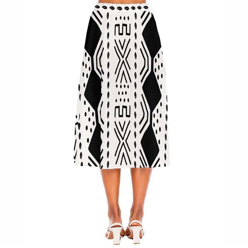 Embrace adventure in our African Skirt Flared | Midi Length! Made with bold White and Black cowrie print, this midi length skirt is perfect for your wardrobe. Its flared design adds a sense of motion, inviting you to step out of your comfort zone and make a statement. Don't miss out on this daring piece!