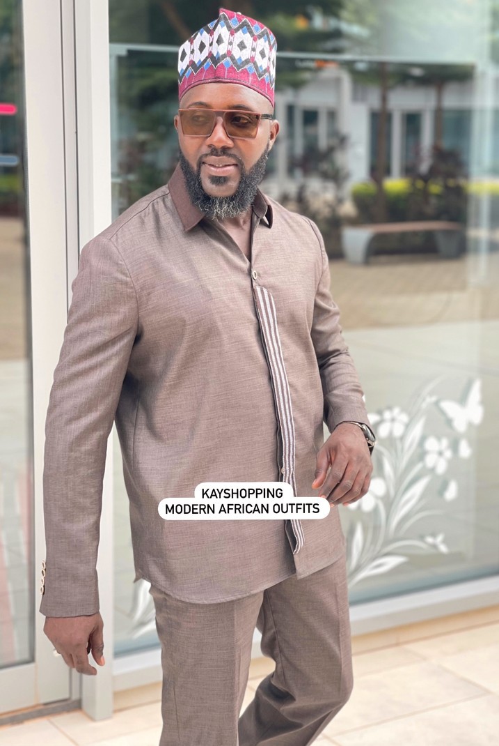 Costume Africain Chemise Marron cousu avec de la laine. Modèle Chemise travaillé avec du pagne tissé.