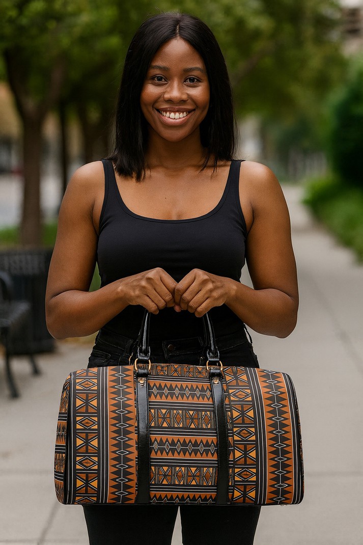 Get ready to travel in style with our African Travel Bag featuring a unique Leather Geometric Afro Print design. This bag truly stands out, making a statement wherever you go. Perfect for the adventurous and fashion-forward traveler! Product Description * Made of New high-grade PU leather, not easily wrinkled. • Features PU leather top handle and binding for comfortable carrying. • One main compartment, big enough to bring clothing, cosmetic bag, sunglasses • Come with adjustable shoulder strap with metal clips. • Suitable for workout and short-term or long-term travel. • Wipe gently with cloth. Delivery Time This item will be processed within 3-7 business days (Excluding Weekends and Holidays). Once products ships it can take up to 15 Business days depending on your location. Out of Stock items can be requested by emailing us at [email protected] Care Instructions Machine wash cold inside out. Gentle cycle with mild detergent and like colors. Do not use bleach or fabric softener. Do not tumble dry. Hang to dry to ensure maximum shelf life. Iron inside out if necessary. Do not iron the print. Do not dry clean.
