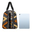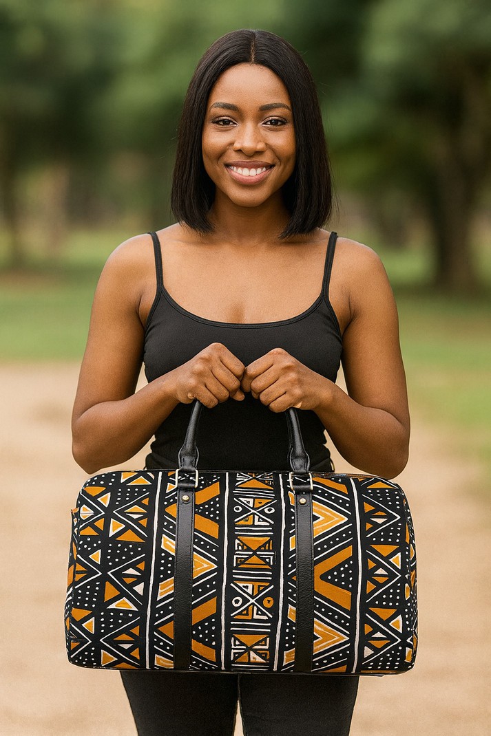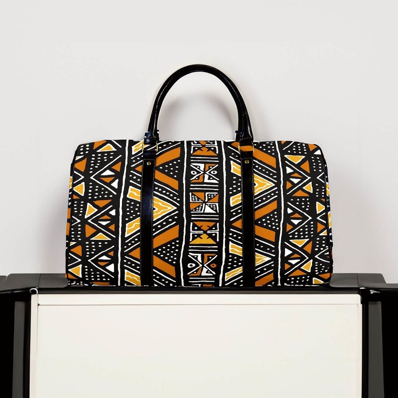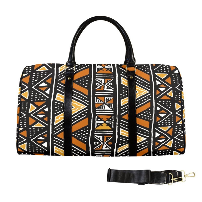 Experience the vibrant culture of Africa with our African Travel Bag. Crafted from genuine leather, this bag features a unique Native Bogolanfini Print. Perfect for your next adventure, this bag combines style and functionality. Say “jumbo” to your new favorite travel companion! (No elephants were harmed in the making of this bag.) Product Description * Made of New high-grade PU leather, not easily wrinkled. • Features PU leather top handle and binding for comfortable carrying. • One main compartment, big enough to bring clothing, cosmetic bag, sunglasses • Come with adjustable shoulder strap with metal clips. • Suitable for workout and short-term or long-term travel. • Wipe gently with cloth. Delivery Time This item will be processed within 3-7 business days (Excluding Weekends and Holidays). Once products ships it can take up to 15 Business days depending on your location. Out of Stock items can be requested by emailing us at [email protected] Care Instructions Machine wash cold inside out. Gentle cycle with mild detergent and like colors. Do not use bleach or fabric softener. Do not tumble dry. Hang to dry to ensure maximum shelf life. Iron inside out if necessary. Do not iron the print. Do not dry clean.