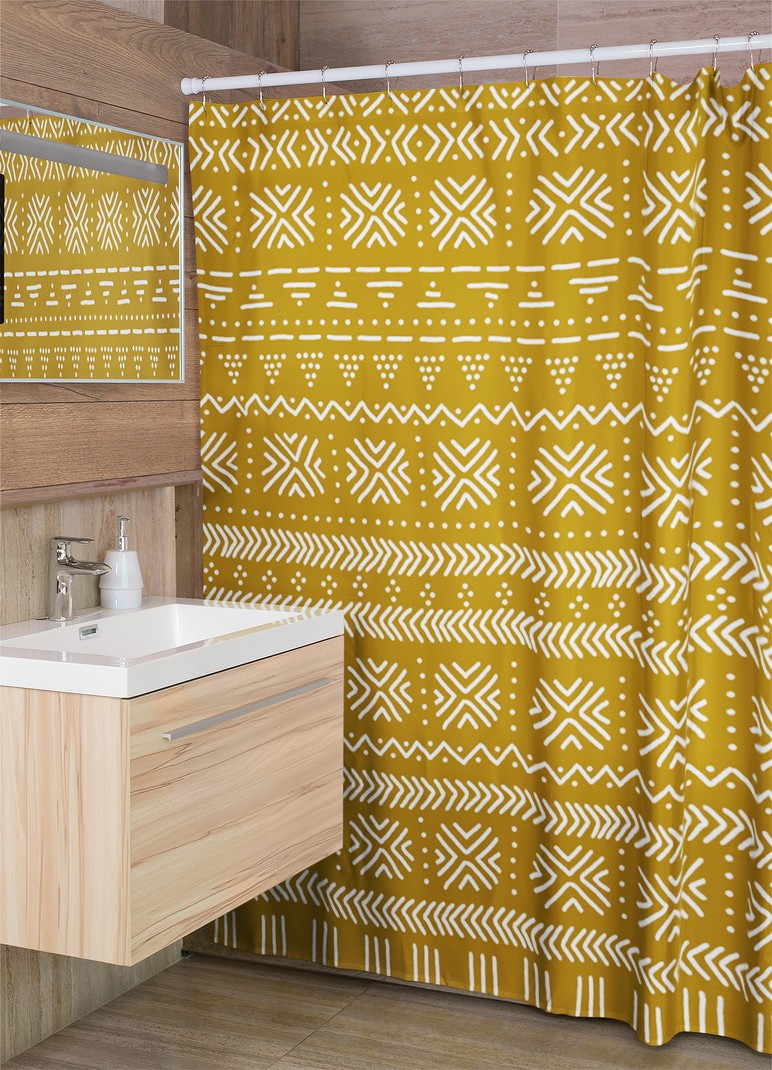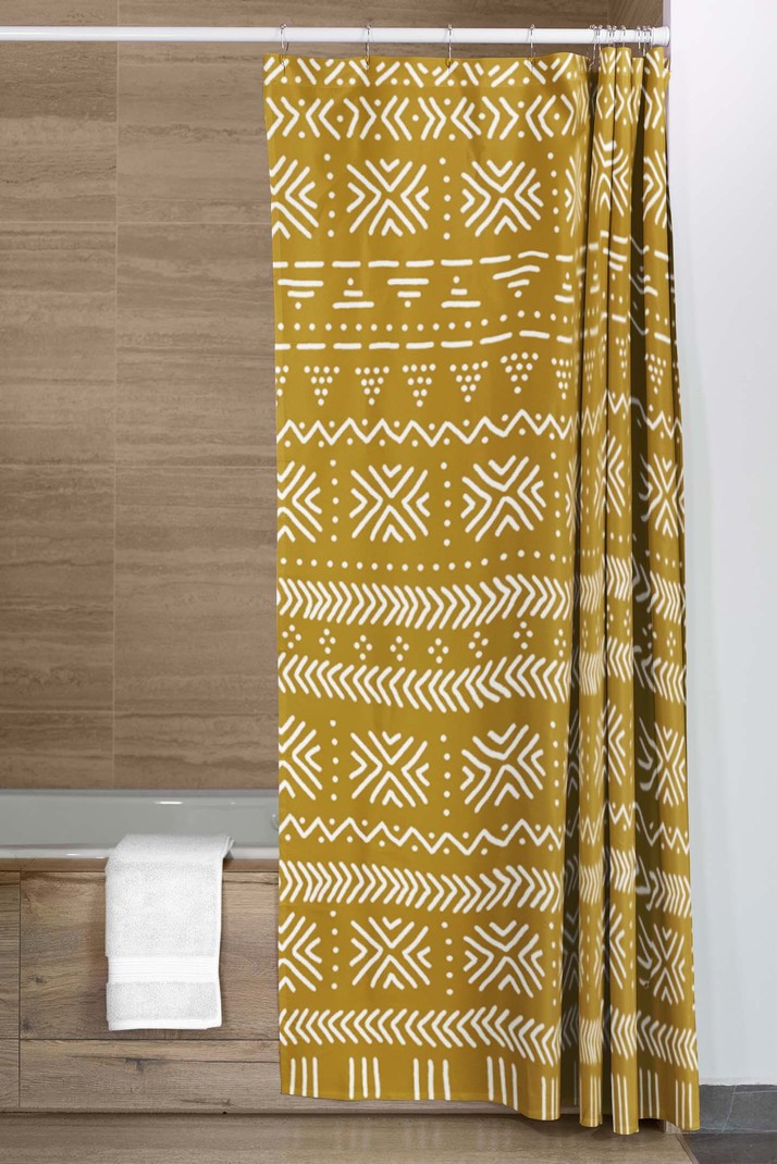 Transform your boring bathroom into a bold and daring space with our African White Gold Shower Curtain! Featuring an intricate mudcloth print, this curtain adds a touch of adventure and risk-taking to your daily routine. Elevate your shower experience with this unique and stylish addition.