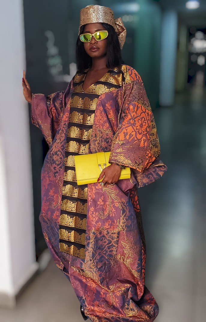This piece screams African royalty. It is an exquisite piece, carefully crafted from a combination of two different damask fabrics of the highest quality. Damask fabrics are used to make African outfits for big and important ceremonies.