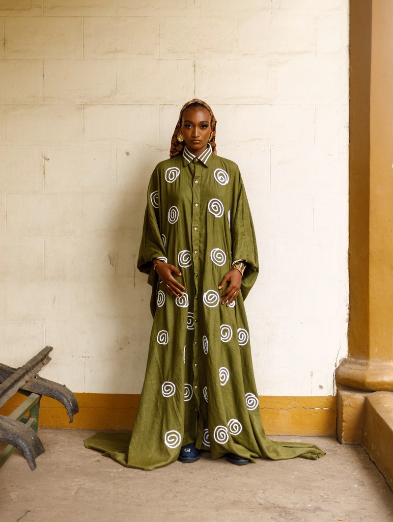 A bold reimagining of tradition, the Agbada Long Dress merges heritage with contemporary elegance. Designed as a universally sized, genderless statement piece, this shirt dress is inspired by the regal Agbada, embodying effortless sophistication. Crafted from locally sourced deadstock linen, it is elevated with intricate 3D embroidery details inspired by the Cute-Saint emblem, symbolizing artistry and identity. The collar and cuffs are adorned with 3D embroidered stripes, adding a refined touch to the flowing silhouette. A snap-button opening offers adaptability, making it easy to style across occasions. A celebration of culture and modern versatility, the Agbada Long Dress is a powerful expression of confidence, comfort, and craftsmanship.