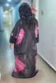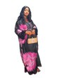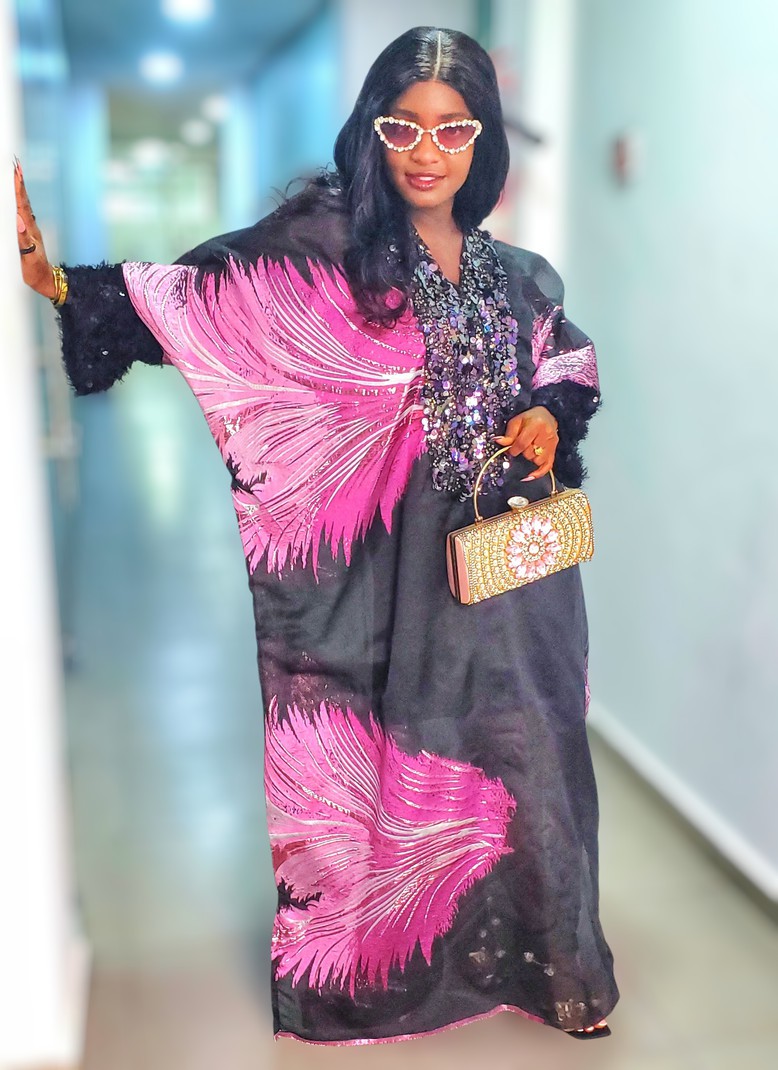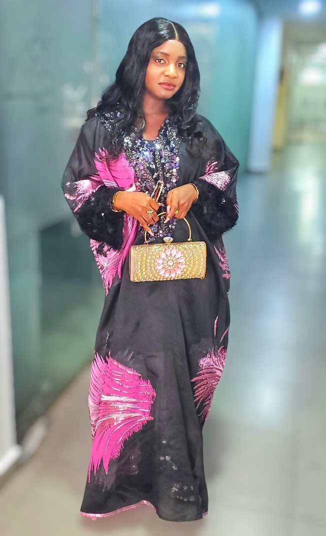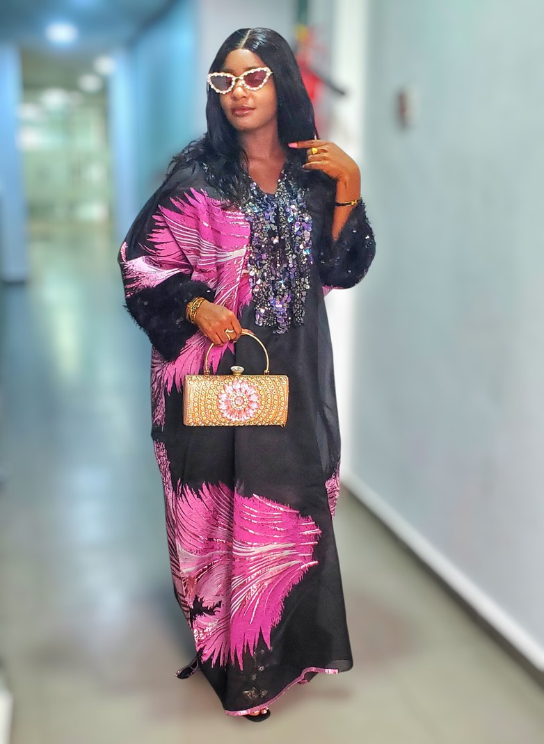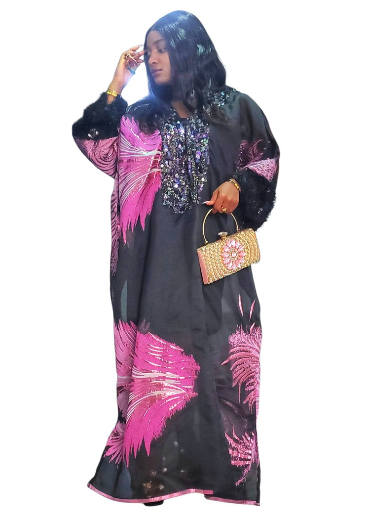This piece is designed as a kaftan dress. The sequin design on the neck to chest area and the sequin fur fabric used to design the sleeves give it a look of sophistication and high fashion.