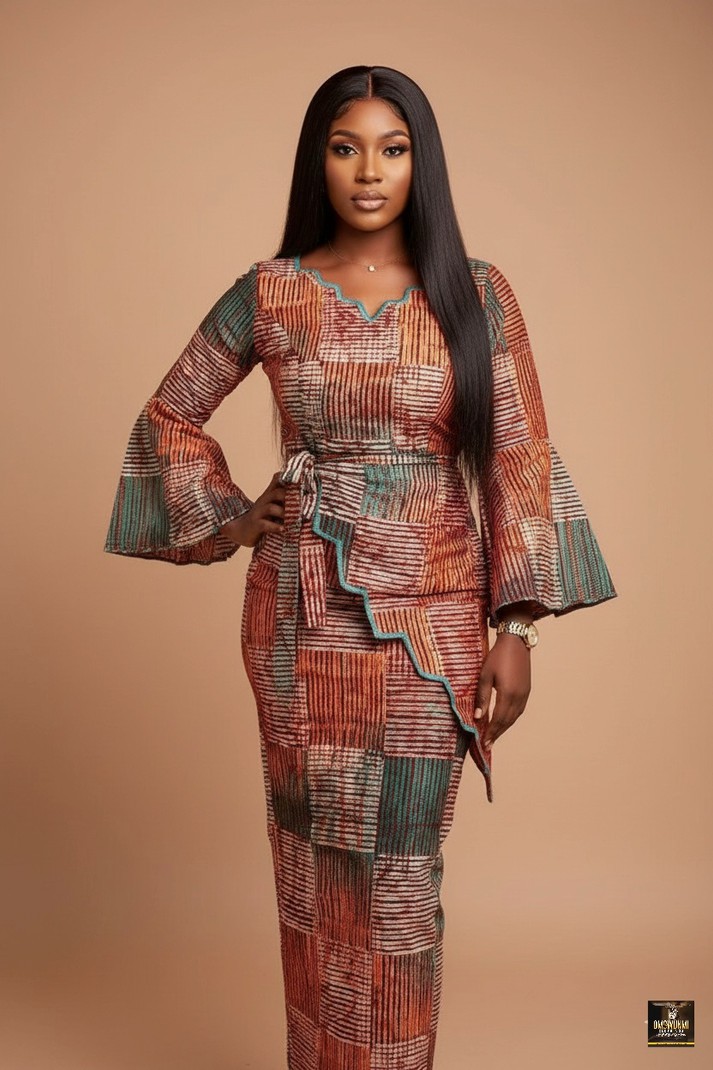 This sophisticated dress offers a contemporary and elegant take on African textile design, creating a refined and artistic statement piece. The garment features a flattering fitted bodice and mermaid silhouette that hugs the body before dramatically flaring out near the hemline, enhanced by a stylish, asymmetric peplum or scallop-edged wrap detail at the waist. It is constructed from a textured batik fabric, showcasing a cohesive patchwork print in a warm palette of burnt orange, terracotta, and teal/mint green, creating a visually rich, autumnal aesthetic. The dress is further defined by elegant flared or bell sleeves that add movement and drama, making this ensemble an ideal choice for occasions such as traditional ceremonies and weddings (as a guest), high-end cocktail parties and receptions, formal business or networking events, or any sophisticated gathering where you wish to showcase culturally-inspired, tailored elegance.