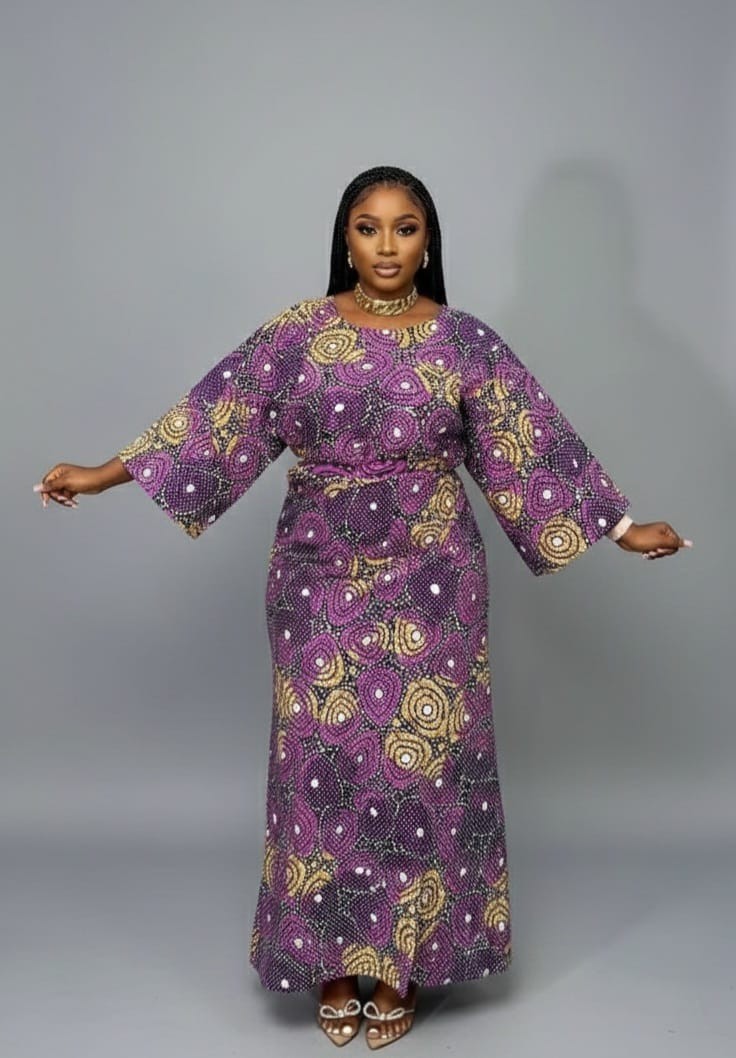 This Radiant Iro & Buba is a breathtaking display of artisanal craftsmanship and modern feminine style, expertly tailored from premium, breathable cotton for a soft yet structured finish. The garment features a vibrant violet and gold palette, meticulously achieved through traditional hand-dyed Batik techniques that create a captivating pattern of swirling, multi-tonal circles. Its silhouette is defined by an elegant rounded neckline, a subtly cinched waist to provide a flattering shape, and dramatic wide-cut sleeves that offer a sense of regal movement. This floor-length outfit is an exceptional choice for high-profile cultural celebrations, elegant evening receptions, or upscale garden parties where a blend of heritage and contemporary glamour is desired. Whether attending a boutique art opening or a festive family milestone, this piece ensures a commanding and artistic presence.
