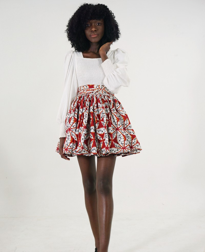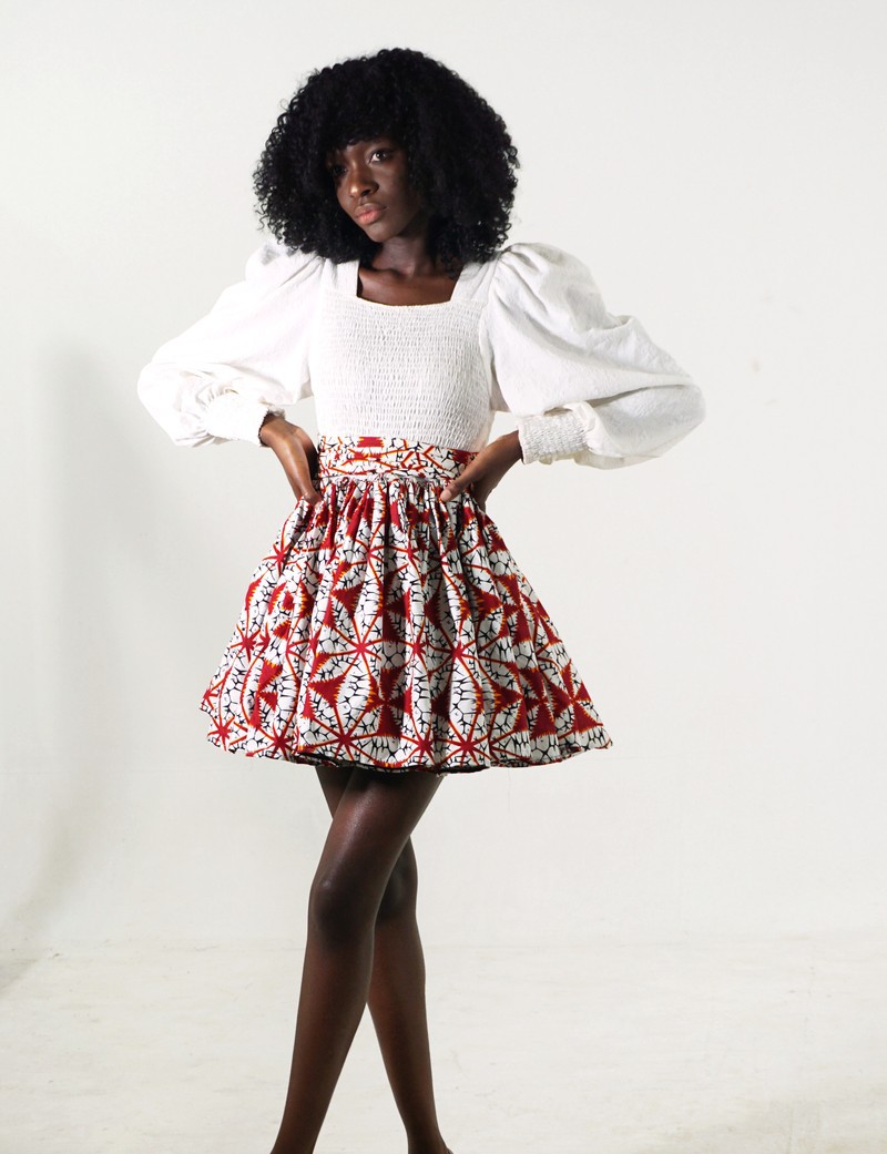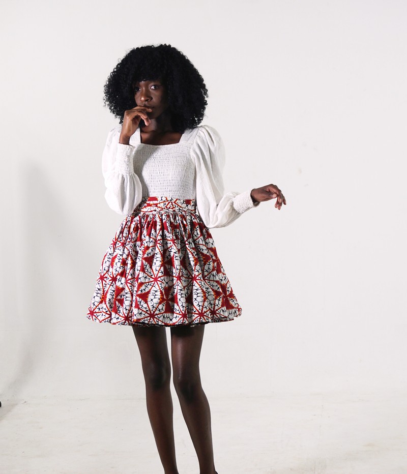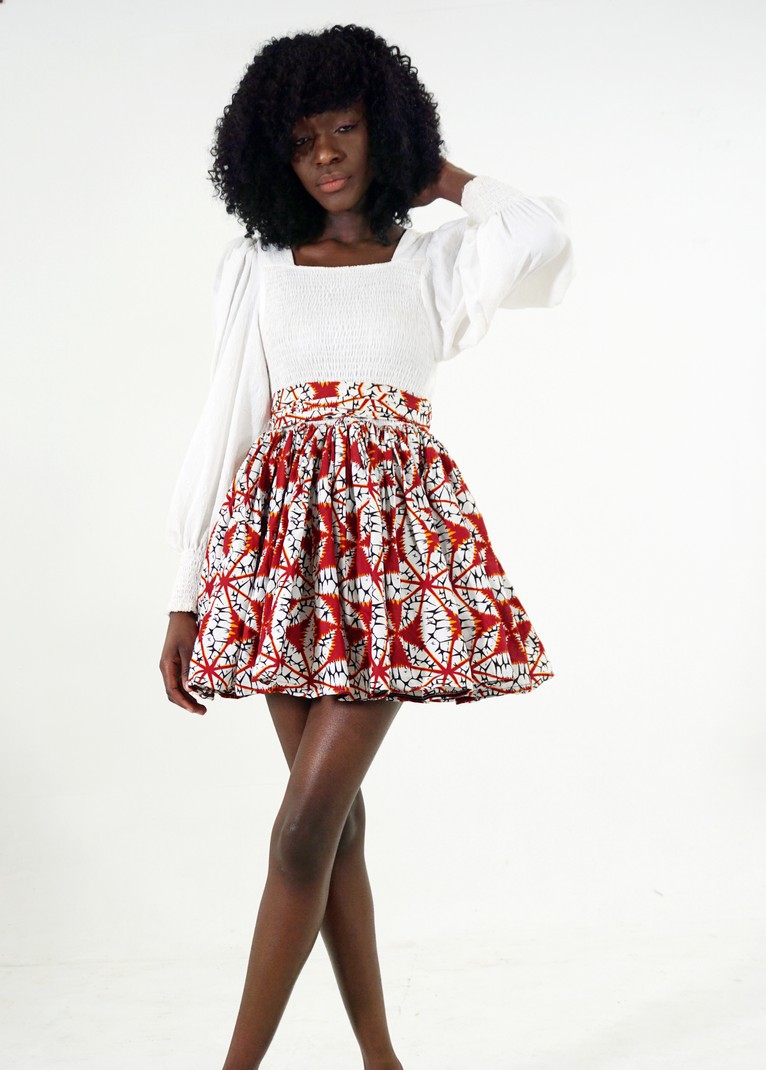 This beautiful mini dress is perfect for the summer, cut from a vibrant Red African print and white chiffon the AKECH will make heads turn this summer. The chiffon is smoked for extra comfort, the hands are puffy and long-sleeved for that classy look. This perfect little flared number can be rocked with heels, sandals, or sneakers depending on your mood. Comes with a belt and a free mask.