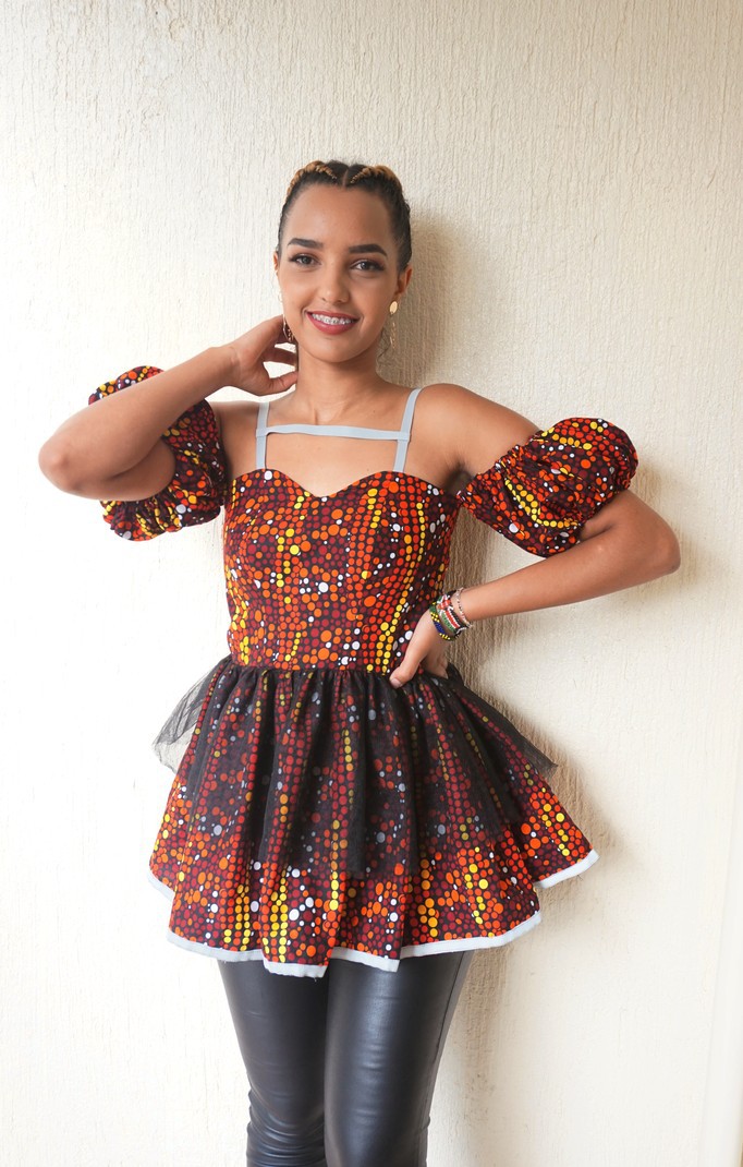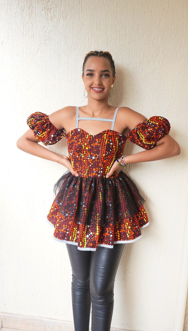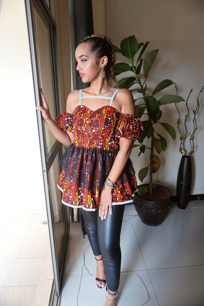 Vous êtes vêtu d'être mieux habillé du bureau à l'église dans cette silhouette imprimée africaine chic. Portez le haut polyvalent à épaules dénudées et basque Akira African Print dans l'imprimé ankara rouge, jaune, blanc et noir pour compléter votre garde-robe d'été. La maille noire autour du basque ajoutera une touche supplémentaire 'L'agrafe unique peut être associée à un pantalon en denim / noir détruit pour le cocktail ou une jupe noire pour les fonctions décontractées professionnelles. Description: Bretelles réfléchissantes sur l'épaule Peplum Maille noire 100% coton africain Fabriqué au Kenya Instructions d'entretien: LAVAGE À LA MAIN. DÉTERGENT DOUX. NE PAS JAVELLISER. Modèles HAND TO DRY: Hauteur: 5'6 | Taille M