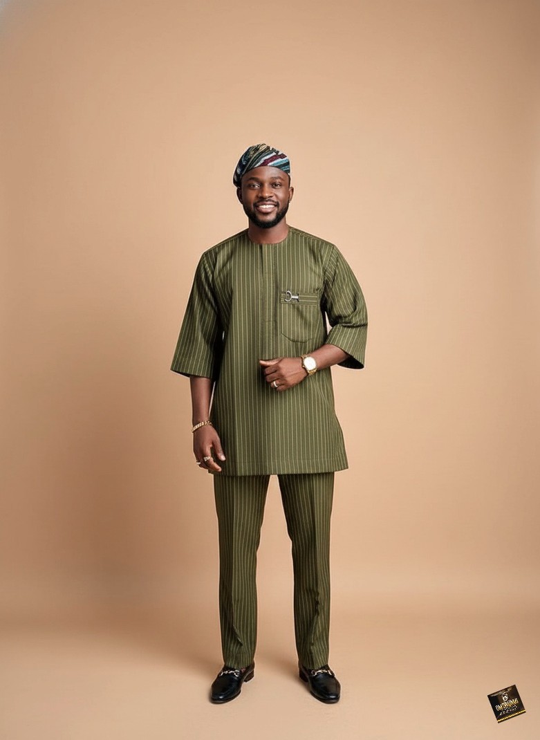 This sharp and stylish kaftan set updates a classic design with a modern pinstripe, crafted in a rich olive green fabric that features subtle vertical stripes for added texture and height. The tunic-style top maintains a traditional aesthetic with a sleek banded collar and a practical, contemporary twist: a single breast pocket secured by a silver-tone ring accent. The matching tailored trousers continue the striped pattern for a cohesive and elongating effect. This refined ensemble is ideal for cultural festivities, sophisticated gatherings, or elevated casual wear, and is perfectly accessorized with a coordinating patterned cap (fila), creating a polished and distinctive look.