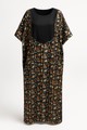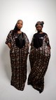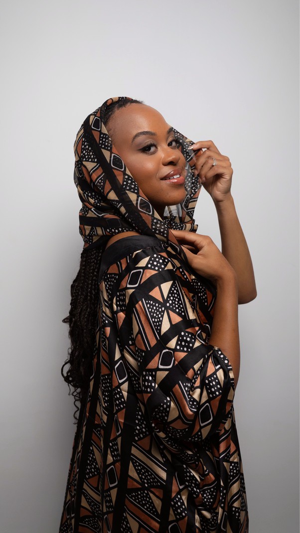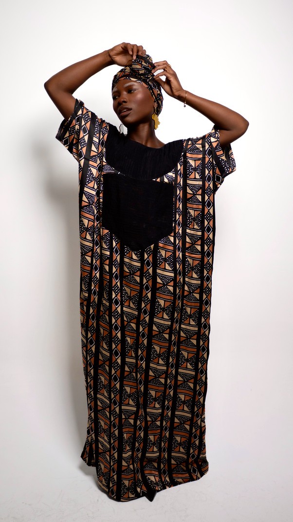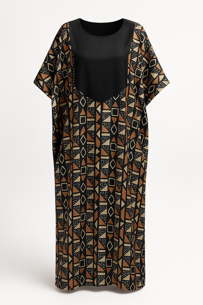 The Amani dress is elegant and comfortable, this dress in slightly shiny satin fabric is distinguished by its African geometric patterns in warm tones. Its loose and fluid design adapts to all morphologies thanks to its one-size cut.