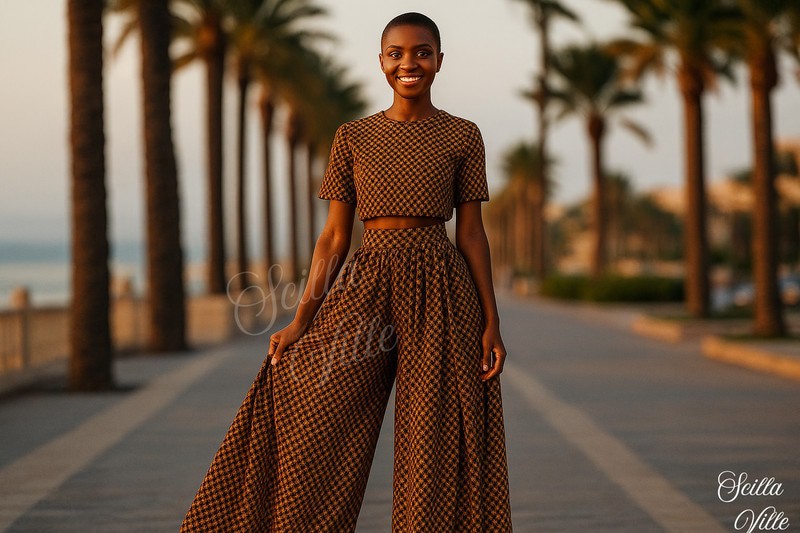 Cropped top and wide pants made with quality ankara fabric. The pants has a band and zip for wearer's ease. Very comfortable and can be worn to different occasions. For custom orders, please provide necessary measurements like;bust 40, waist 30,,top length 18,shoulder to shoulder 15,trouser length 42,arm hole 19,sleeve length 11