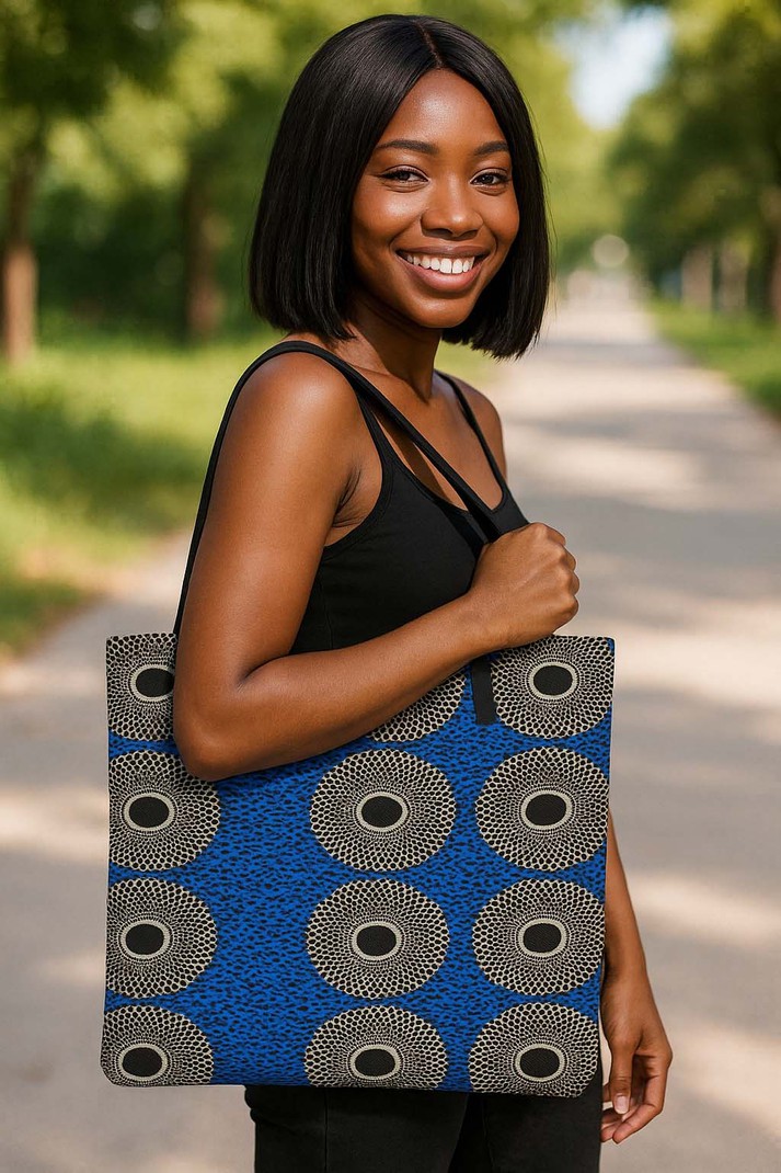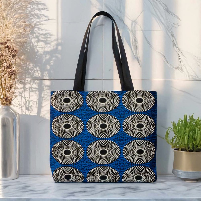 Unleash your bold, adventurous spirit with our African Ankara Tote Bag! As you stride confidently through the day, the vibrant tribal wax print will turn heads and the large capacity will hold all your essentials. Embrace Afrocentric fashion and stand out with this stylish and functional tote bag. Product Description • 510 g/m2. Made from high-grade canvas. • Durable and roomy enough for your daily items. • Lightweight canvas tote bag with sturdy handle is easy to carry. • Perfect for shopping and carrying your essentials. Delivery Time This item will be processed within 3-7 business days (Excluding Weekends and Holidays). Once products ships it can take up to 15 Business days depending on your location. Out of Stock items can be requested by emailing us at [email protected] Care Instructions Machine wash cold inside out. Gentle cycle with mild detergent and like colors. Do not use bleach or fabric softener. Do not tumble dry. Hang to dry to ensure maximum shelf life. Iron inside out if necessary. Do not iron the print. Do not dry clean.