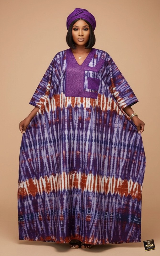 This breathtaking floor-length kaftan is a celebration of artisanal craftsmanship, featuring a mesmerizing purple and ochre tie-dye pattern that flows gracefully across the entire silhouette. Made from a high-quality, lightweight batik, the fabric offers a luxurious drape and a breathable feel, making it as comfortable as it is regal. The design is elevated by a structured V-neckline with intricate tonal embroidery and a matching purple headwrap that completes the traditional yet modern aesthetic. This kaftan is the ultimate choice for grand occasions, such as high-end cultural festivals, elegant religious celebrations, or as a statement "hostess" gown for intimate but formal home gatherings.
