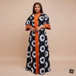 This striking, comfortable floor-length kaftan is presented in a bold black ankara fabric, serving as a backdrop for a lively pattern of large, stylized white flowers with subtle orange detailing in their centers. The dress maintains a relaxed, flowing silhouette with wide, three-quarter kimono sleeves that feature a distinctive orange cuff and trim, perfectly matching the vibrant central placket. This contrasting orange panel runs vertically down the center front of the dress, framing the garment and creating a bold visual break between the patterned sides, resulting in an effortless yet highly impactful look ideal for various occasions.