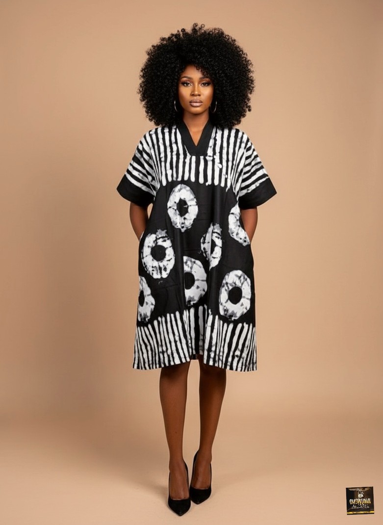 This radiant black dress is elevated by hand-dyed white circular patterns, forming a dynamic and expressive design. The soft cotton fabric and airy cut ensure freedom and ease, making it ideal for warm-weather elegance. Simple yet striking, it embodies the perfect blend of tradition and contemporary flair. Material: Ankara Color: black