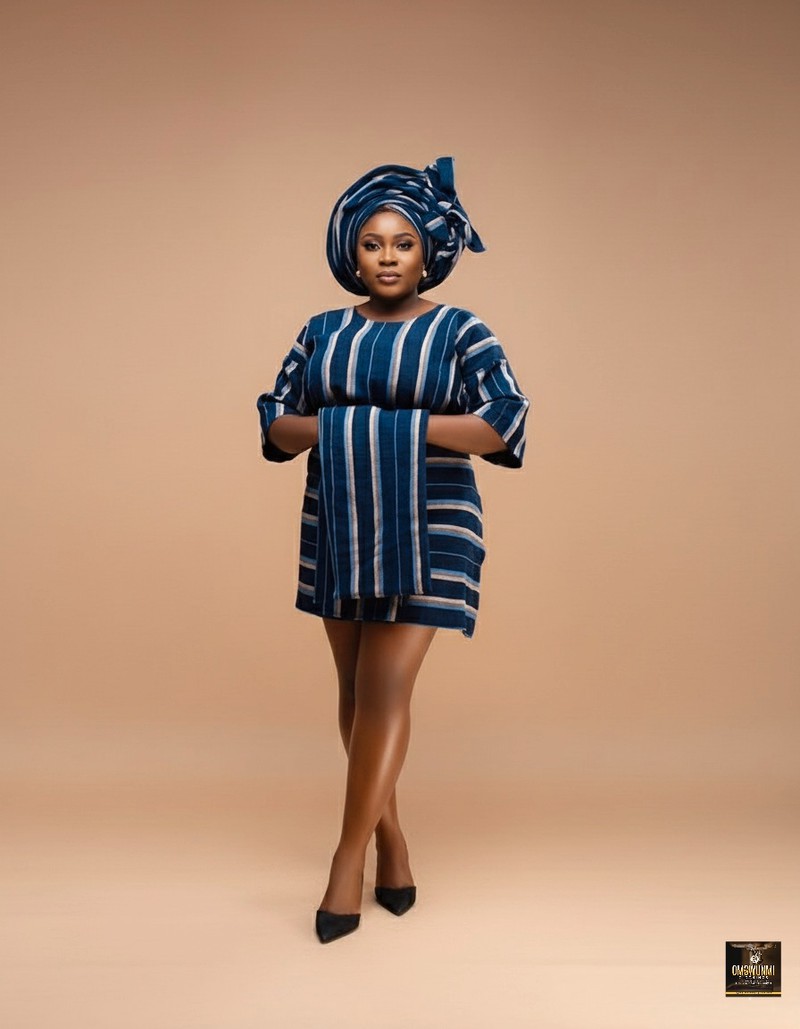 A youthful and vibrant Iro and Buba featuring a bold, all-over pattern of deep blue and crisp white stripes. The short, iro is balanced by wide, three-quarter length kimono sleeves. This piece beautifully highlights the legs while maintaining a demure and cultural flair with its structure and matching, voluminous Gele.