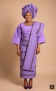 A sophisticated two-piece option. The top is a simple, elegant deep Lilac blouse with a wide neckline and three-quarter sleeves. The floor-length Wrapper & draped shawl (Ipele) feature a complex weave of Lilac, plum, maroon and subtle silver stripes, creating a rich depth of color and movement. This is a timeless option for a formal event.