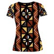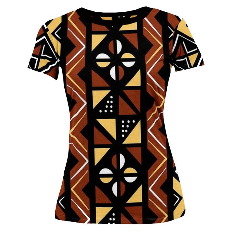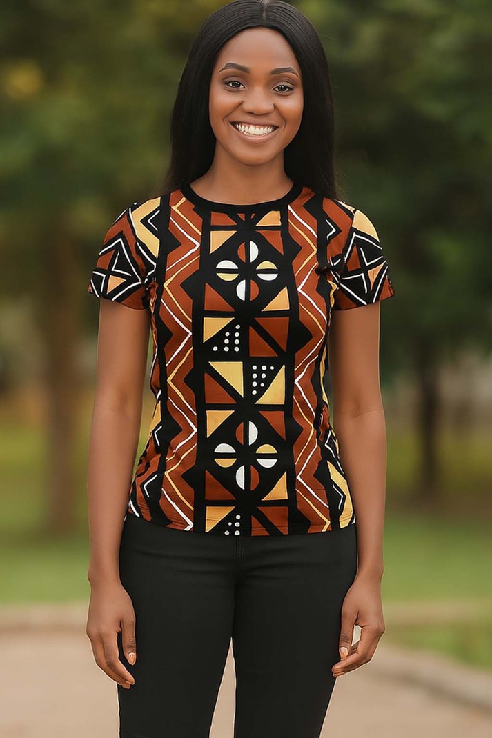 This Bogolan Print Women T-shirt is a unique and stylish way to make a statement. The bold, vivid print is printed on a lightweight and breathable fabric, making this top perfect for any occasion. The eye-catching design is sure to turn heads in any setting.