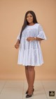 This beautiful, white A-line mini-dress is the epitome of effortless chic and feminine comfort, perfect for a variety of casual and semi-formal occasions, or as a stylish cover-up. The dress is crafted from intricate white lace fabric, featuring a sheer lace-like texture with delicate, that provide lightweight breathability and a subtle glimpse of the lining underneath. It showcases a flattering high, round neckline and a relaxed, voluminous silhouette that drapes gracefully over the body, ending just above the knee in a playful tiered ruffle. The three-quarter length bell sleeves mirror the flowy nature of the skirt, adding an extra element of bohemian elegance and movement. This versatile piece transitions beautifully from daytime outings to evening events, offering a blend of sophisticated detail and relaxed, comfortable wear.
