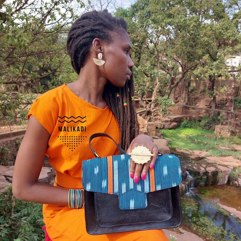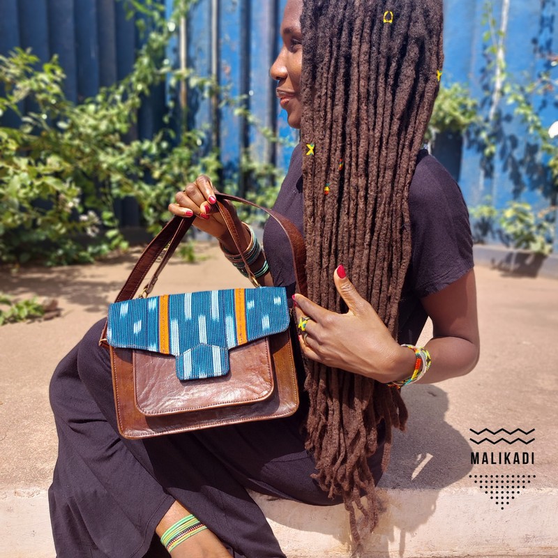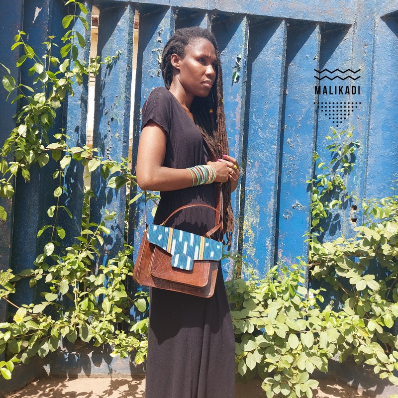 Sac en cuir et pagne baoulé.