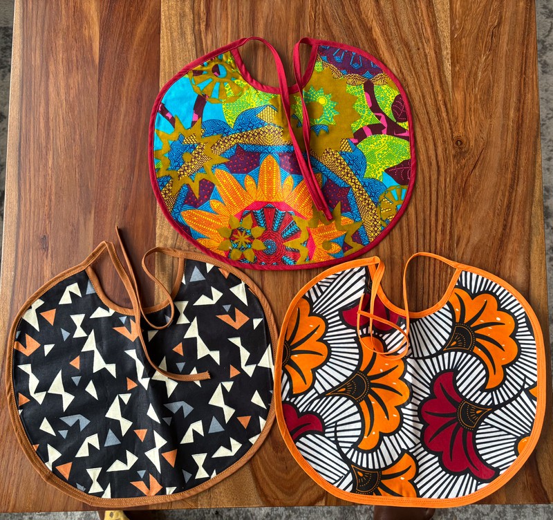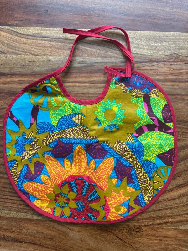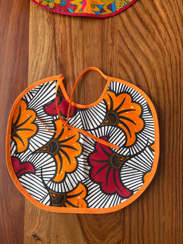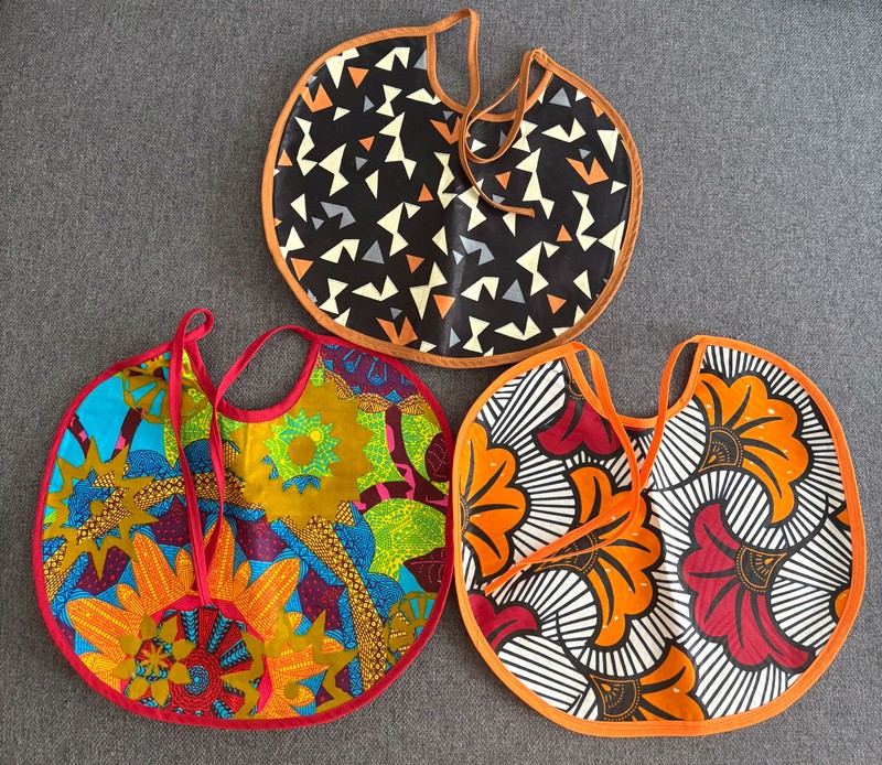 Bavoirs en tissu wax plastifié souple et imperméable pour bébé., attache avec biais en coton dans le dos